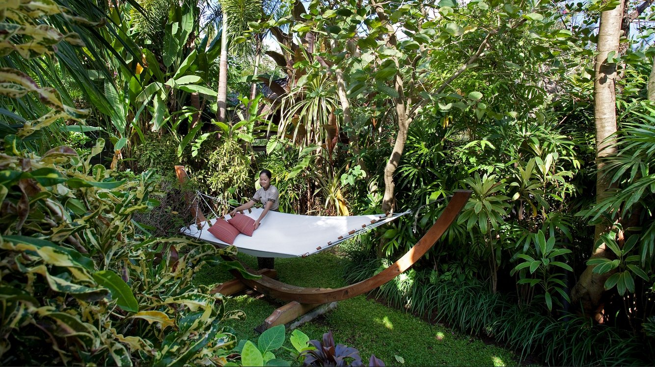 Doors lead to a small kitchenette on one side and a wardrobe and dressing area on the other; both the kitchenette and dressing room open onto a tropical garden bathroom. Across the pond is a second and much smaller gladak which serves as a reading or breakfast room, while across the swimming pool a relaxation balé beckons.
