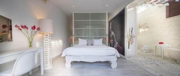This stylish white-on-white residence is artfully adorned with local touches and surrounded by curated greenery. The open-air living space and breezy shaded pergola are perfect for lounging with a book or entertaining friends, while the sun-kissed pool deck invites you to unwind beneath the open sky.