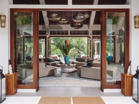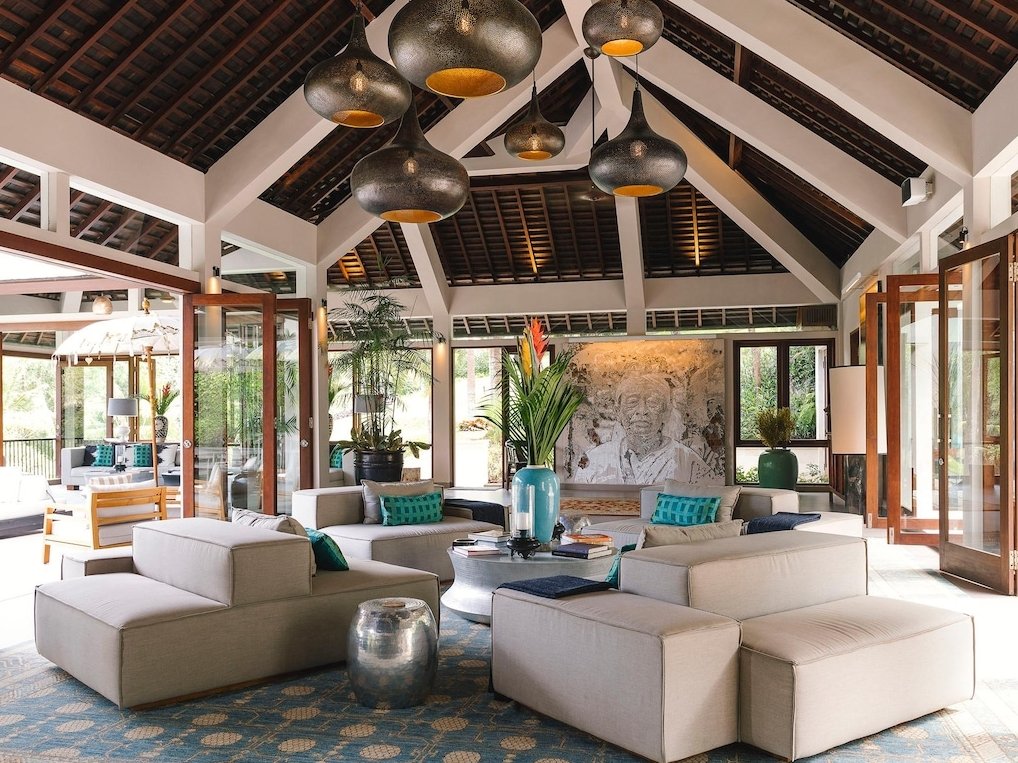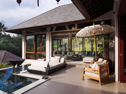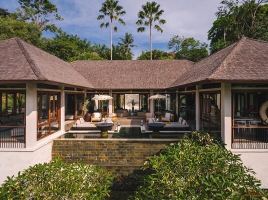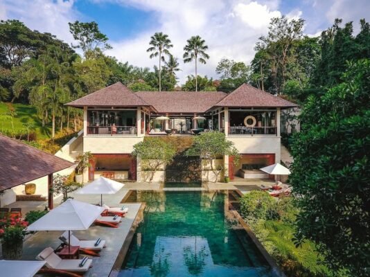 The villa is a spectacular multi-pavilion destination villa spread across two-hectares of terraced gardens bordering a river in south-west Bali’s Tabanan Regency, ten minutes from the iconic Tanah Lot sea temple and Bali’s famed surfing beaches.