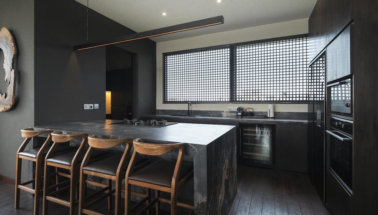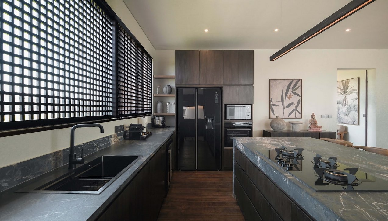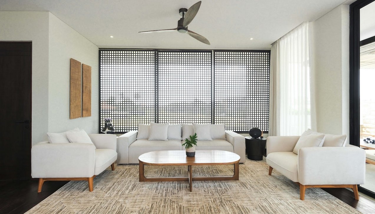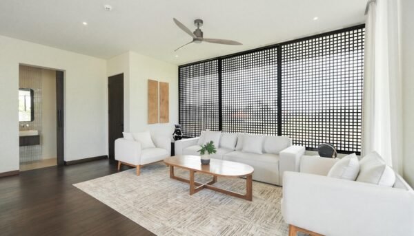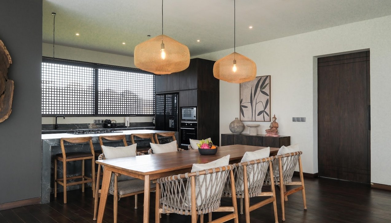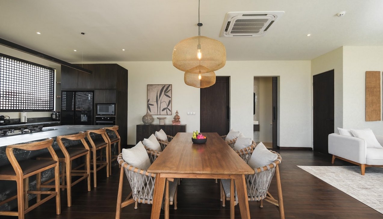 The villa’s enclosed living room is fully air-conditioned, blending warmth and style with contemporary design. The open-plan layout includes: