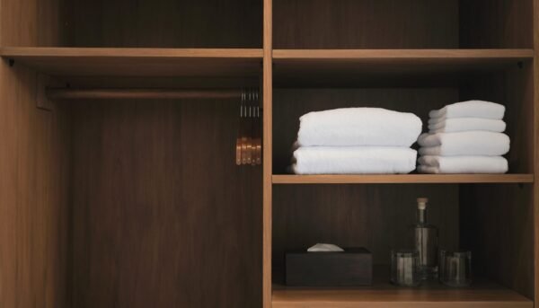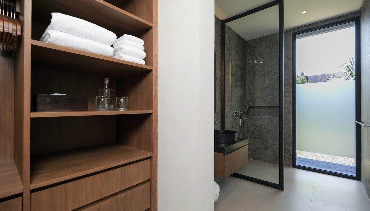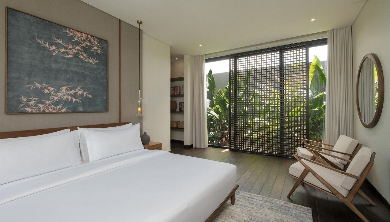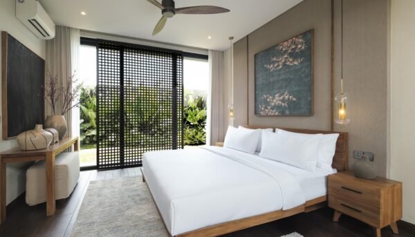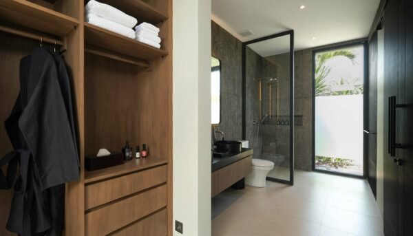 The villa features three elegantly appointed bedrooms, all on the ground floor. Two spacious rooms come with plush king-sized beds and floor-to-ceiling windows overlooking a private garden, while the third offers twin beds for children or friends. Each bedroom includes: