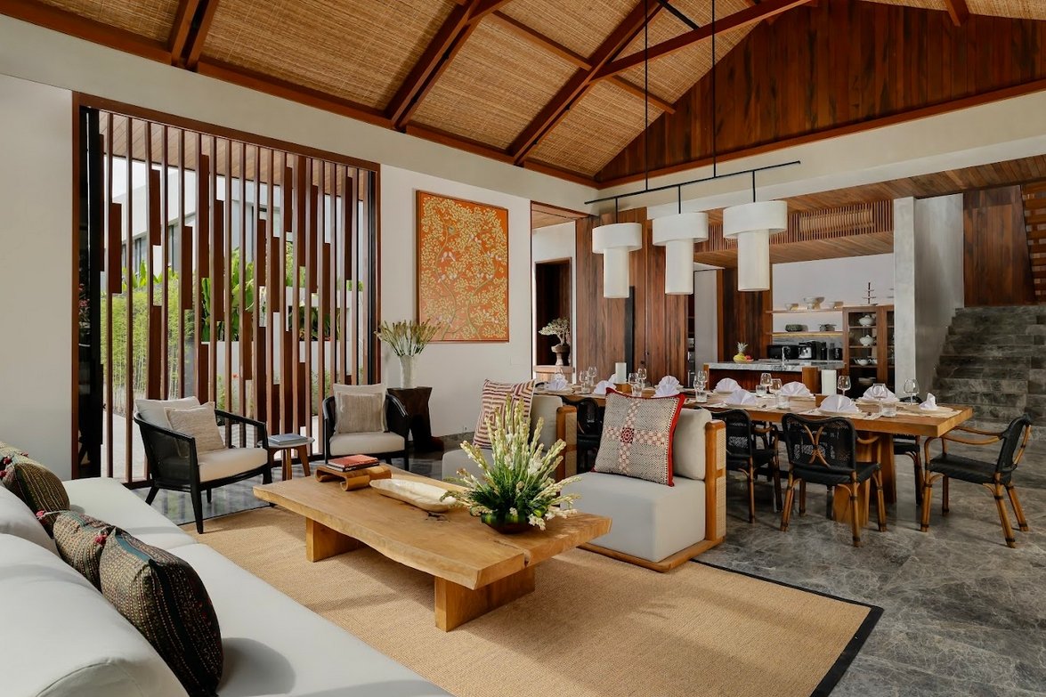 The main living area is designed to feel open, airy, and connected to the outdoors. Large glass doors allow sunlight to flood the space, while high ceilings maintain a breezy, tropical ambiance.
