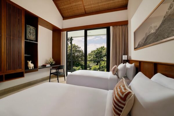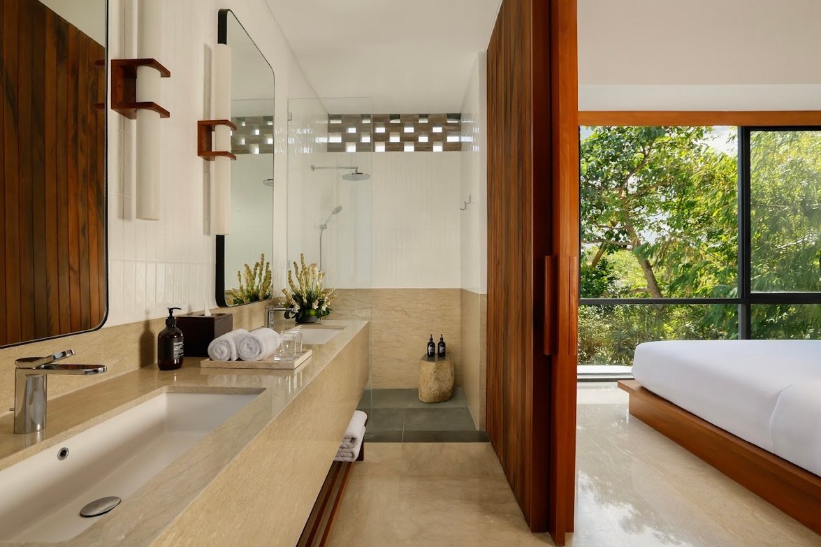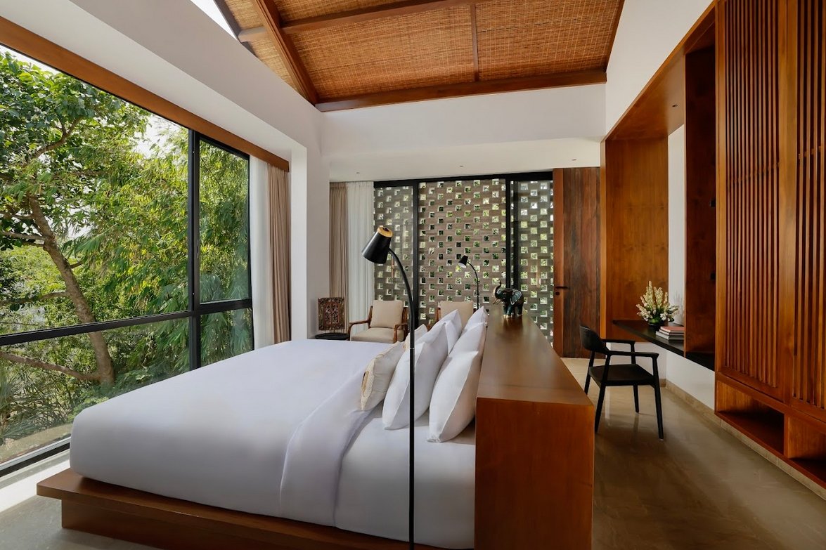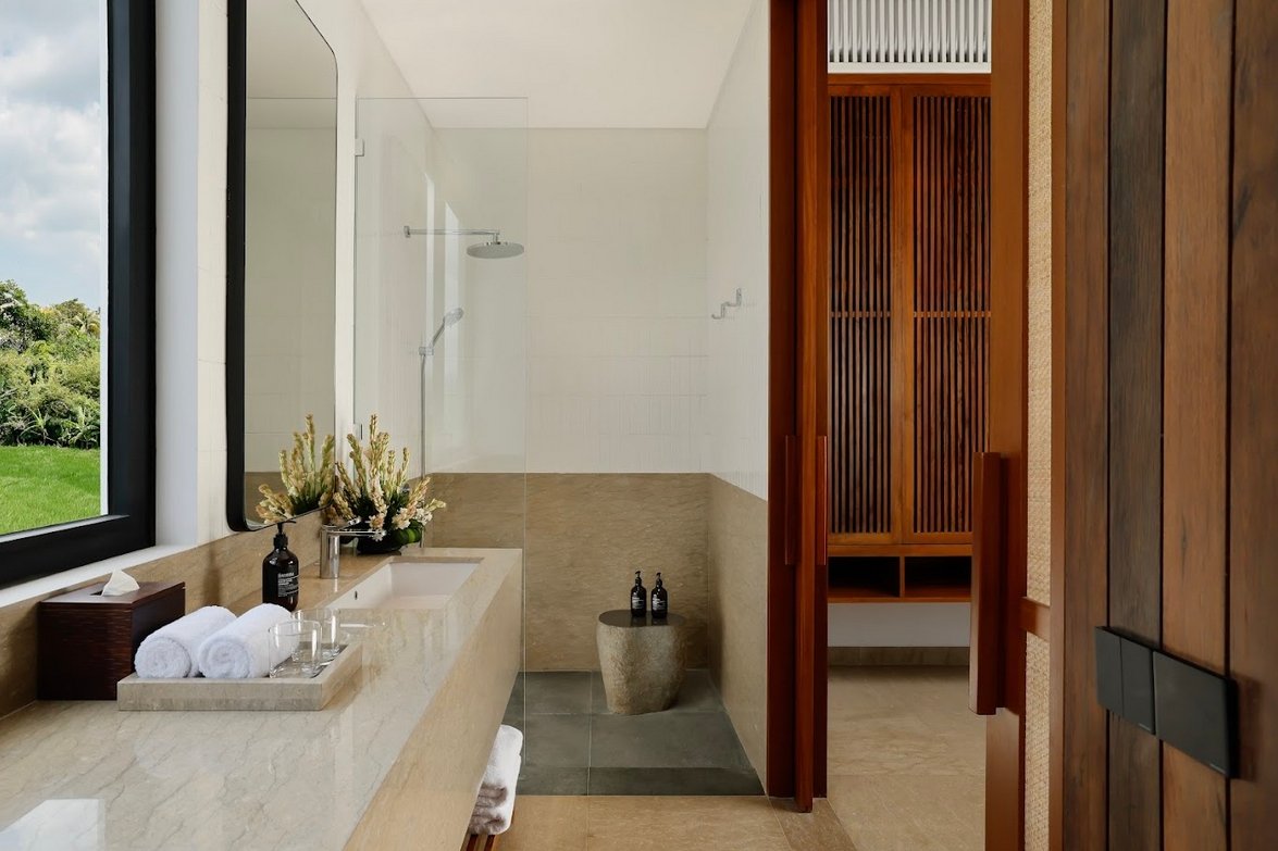 Three bedrooms are located on the ground floor, while four additional bedrooms are upstairs—each featuring air conditioning, en-suite bathrooms, wardrobes, and refreshing semi open-air showers that bring nature into everyday living.