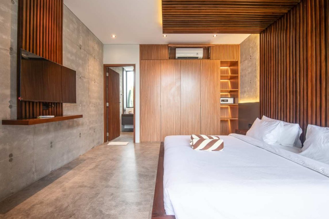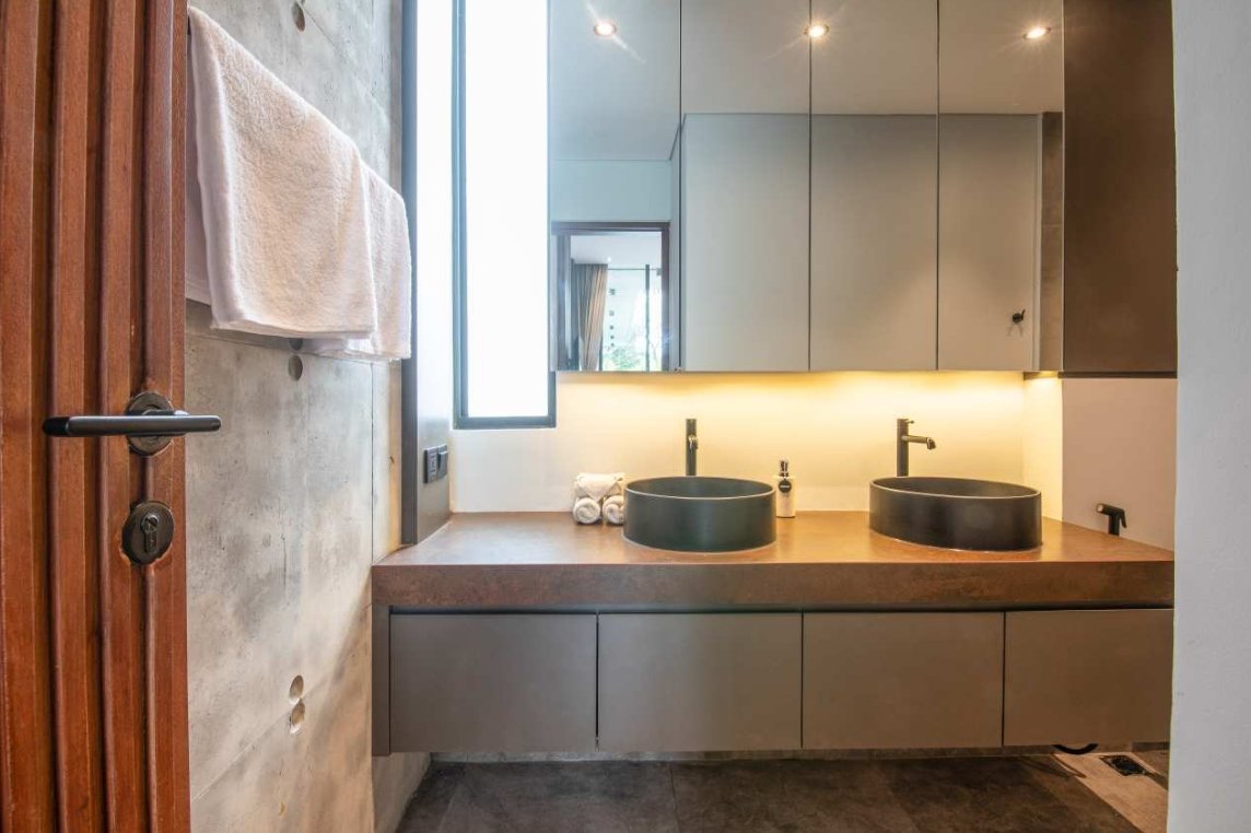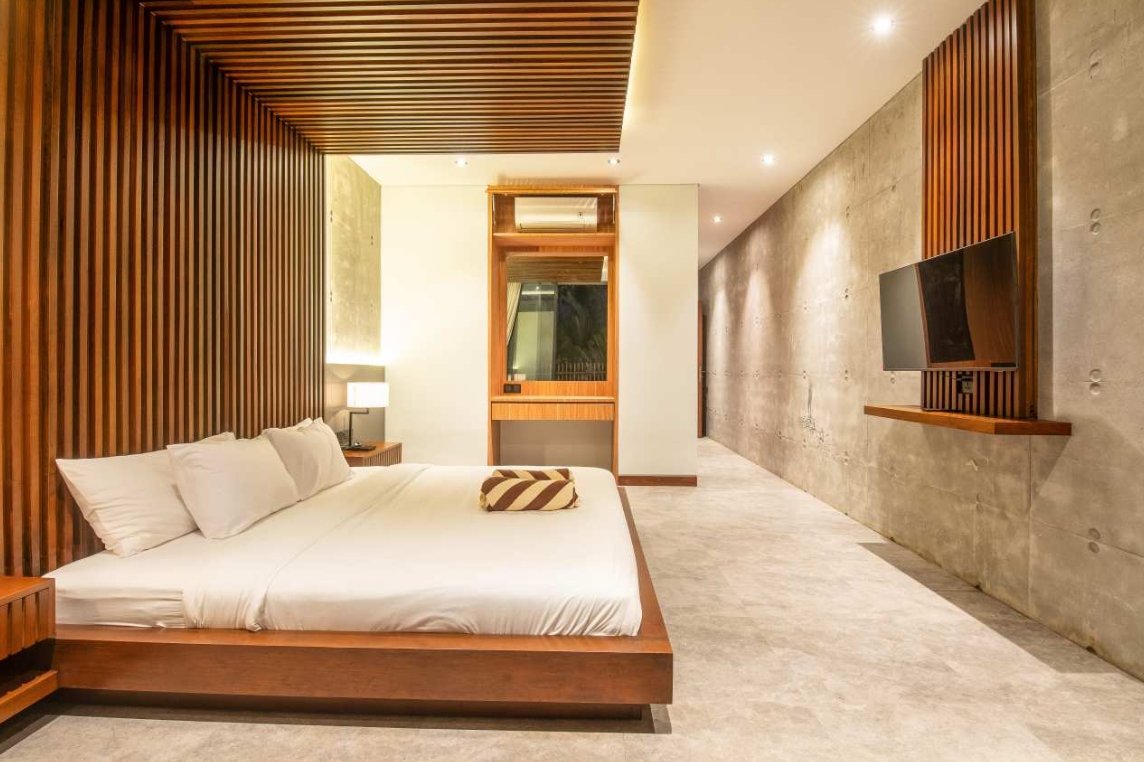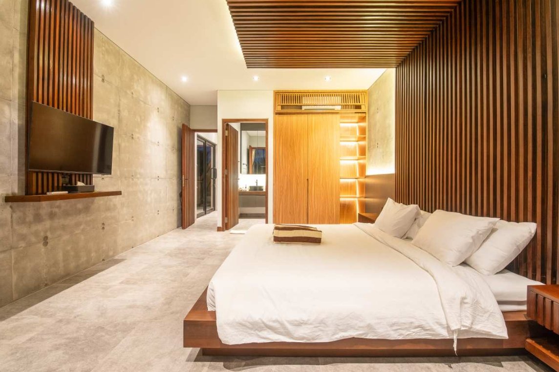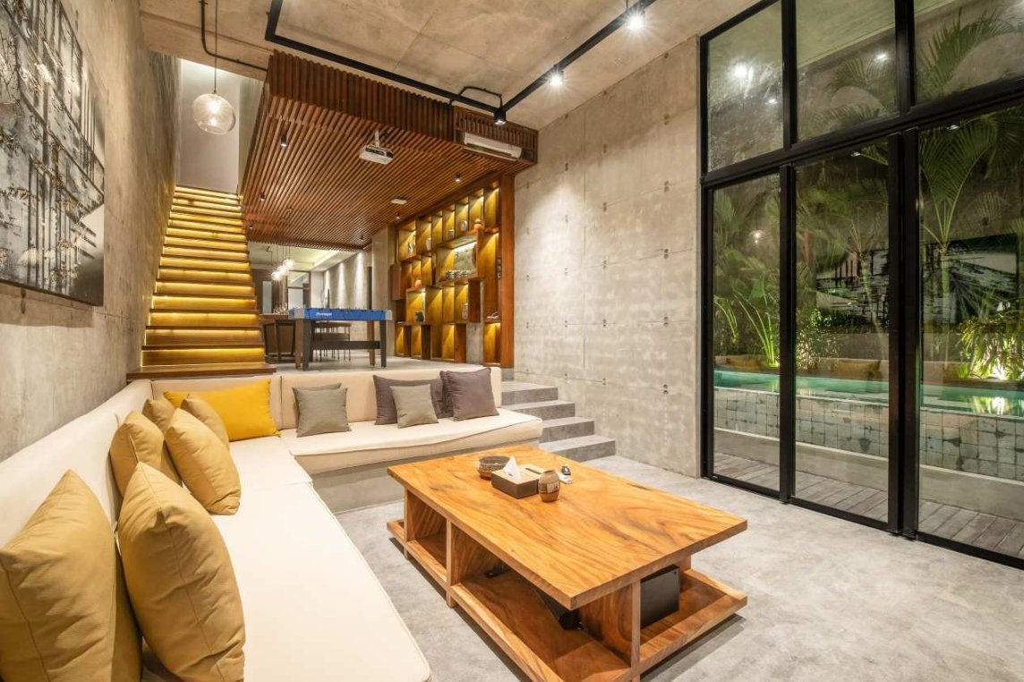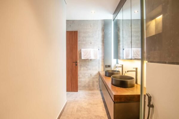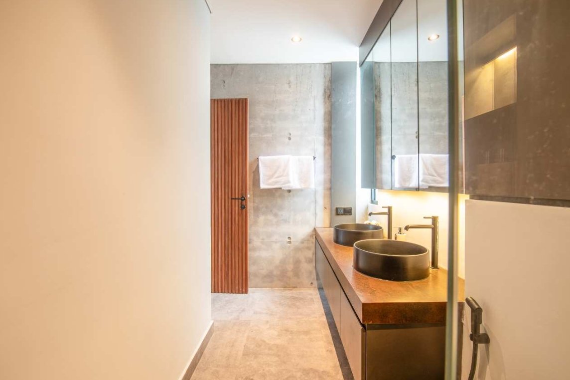Villa Robyn’s features four spacious bedrooms, each equipped with a king-size bed and a private ensuite bathroom. With 4.5 bathrooms in total, privacy is guaranteed—even for large groups. The interiors blend raw concrete walls with warm wood accents, creating a modern yet inviting atmosphere that feels both chic and relaxed.