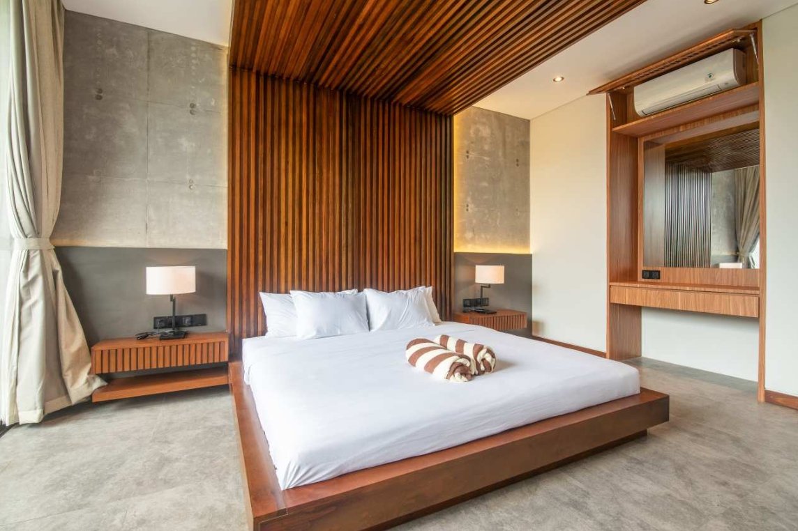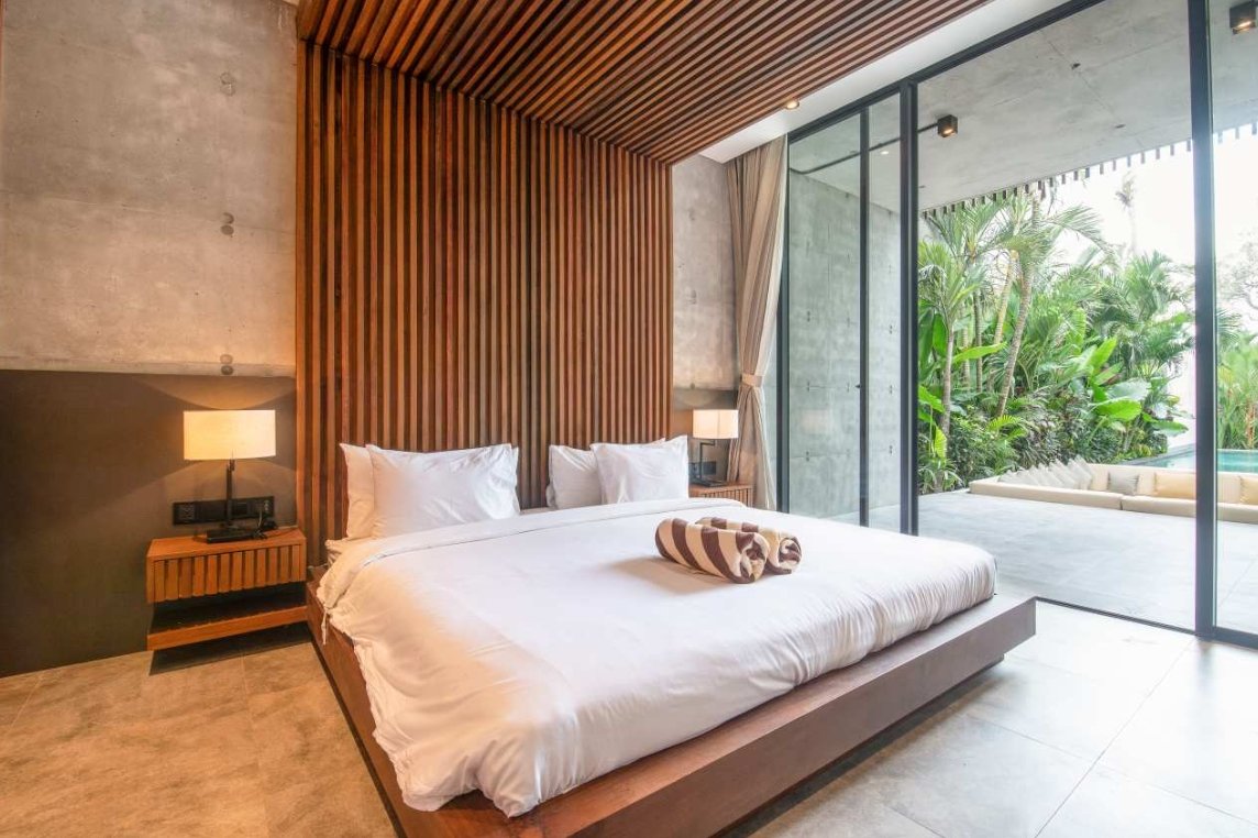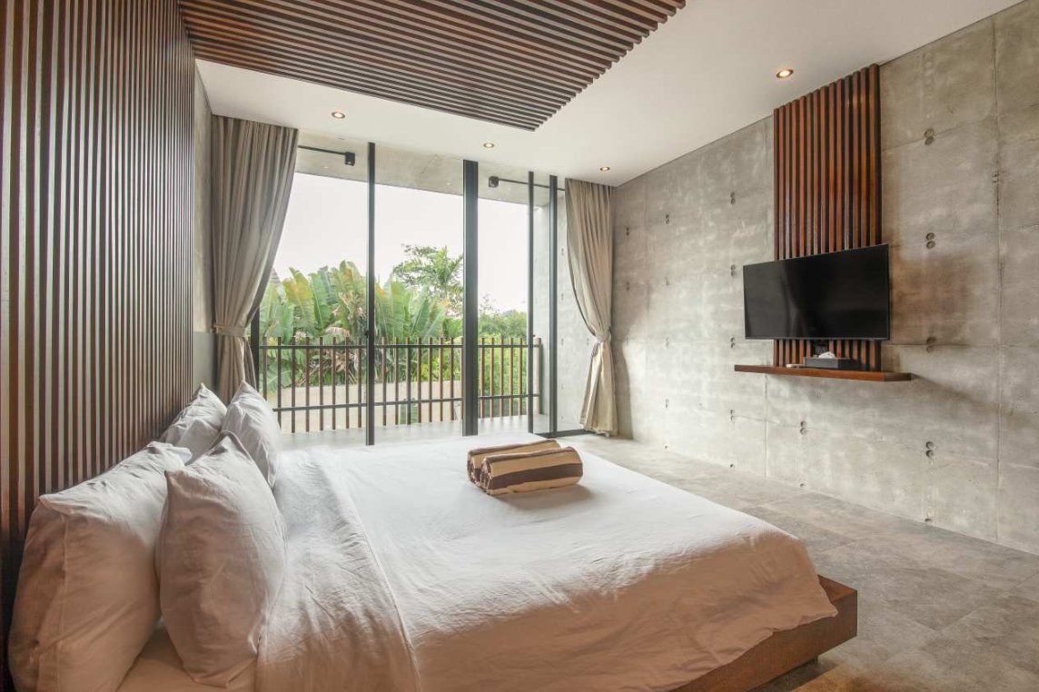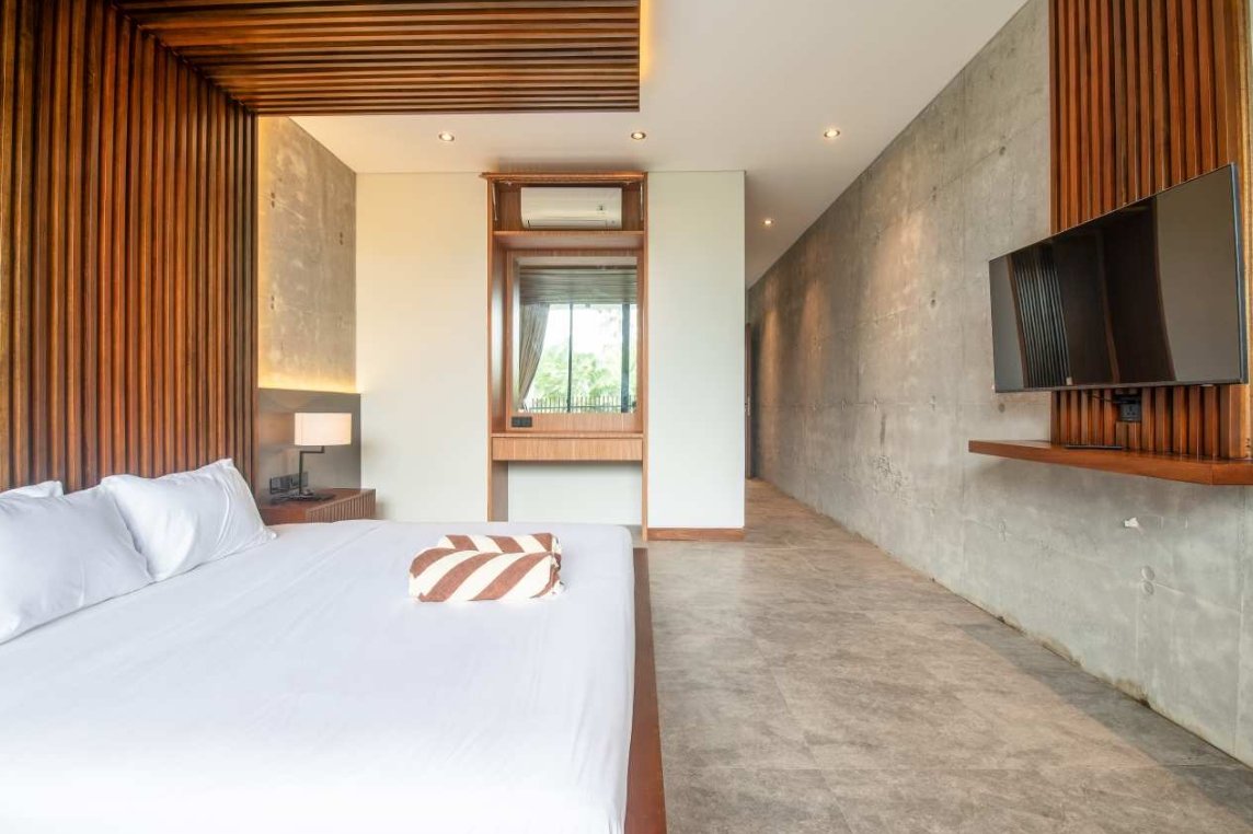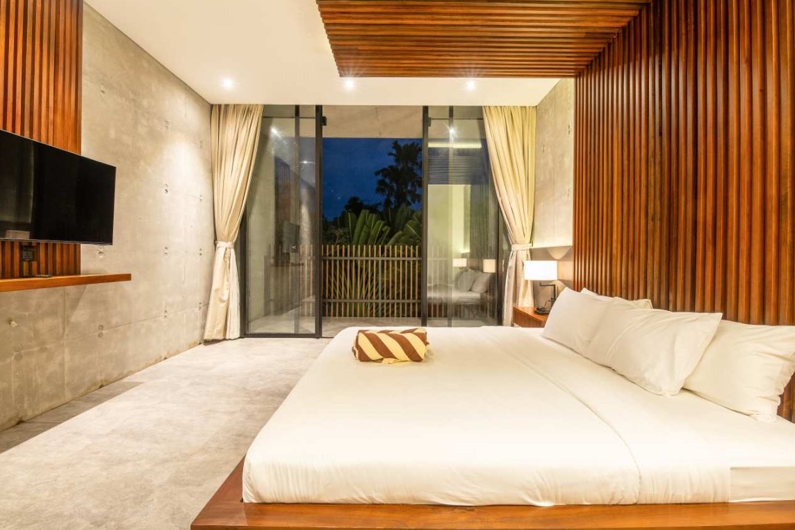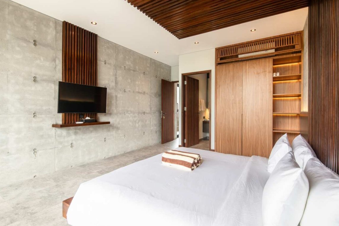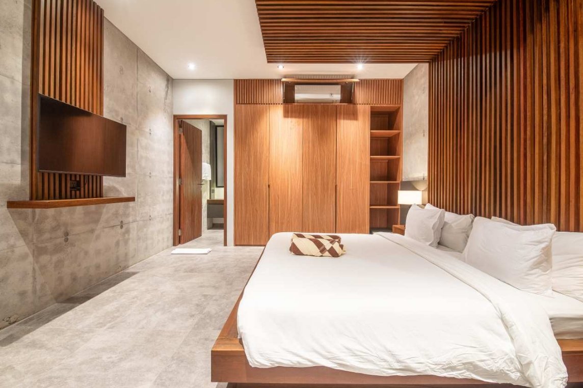 Villa Robyn’s features four spacious bedrooms, each equipped with a king-size bed and a private ensuite bathroom. With 4.5 bathrooms in total, privacy is guaranteed—even for large groups. The interiors blend raw concrete walls with warm wood accents, creating a modern yet inviting atmosphere that feels both chic and relaxed.