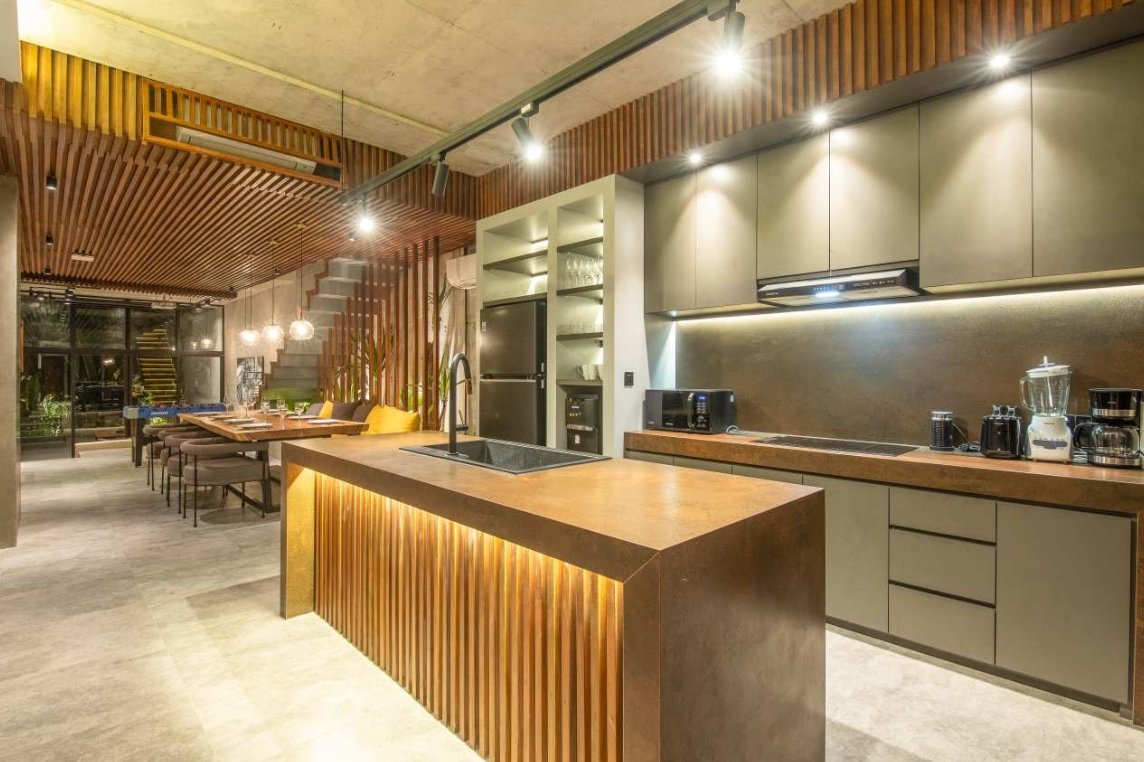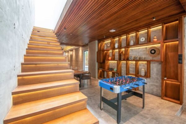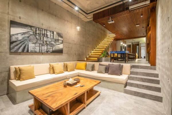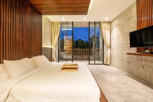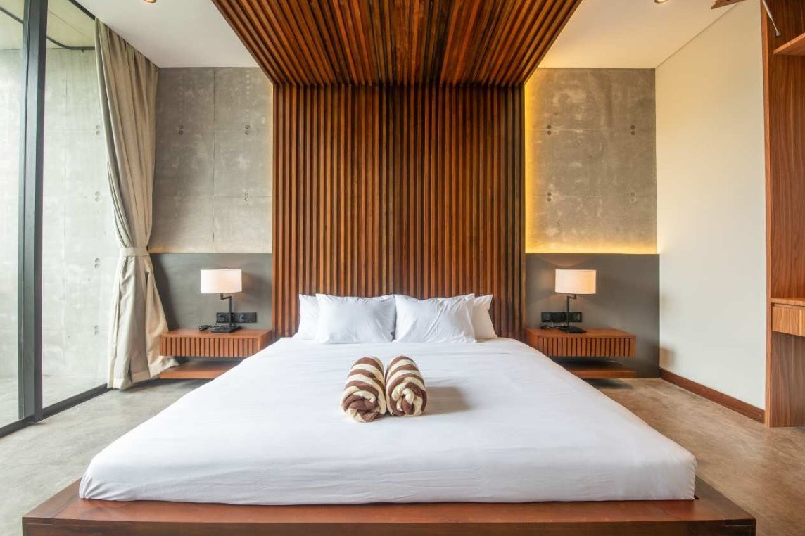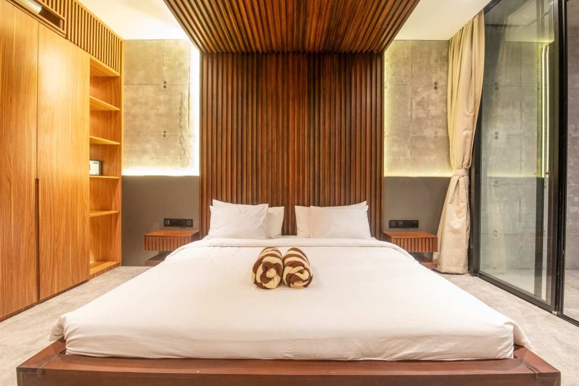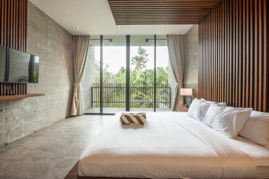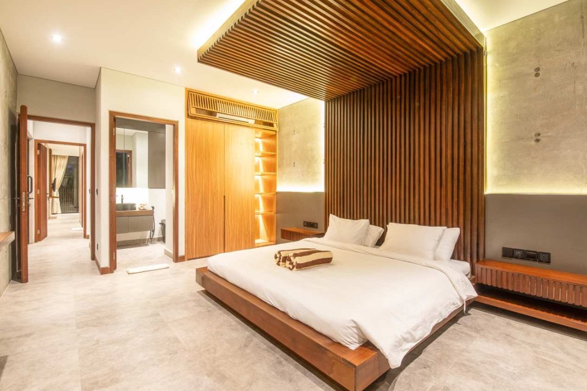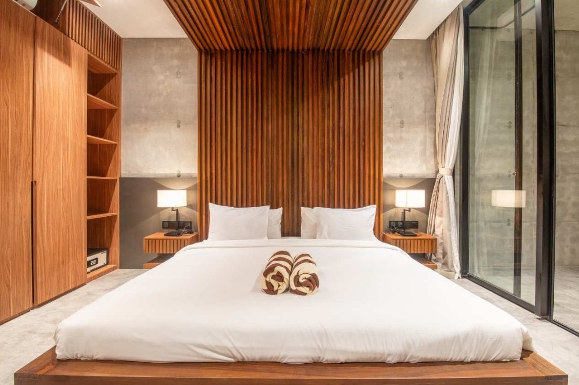 Villa Robyn’s features four spacious bedrooms, each equipped with a king-size bed and a private ensuite bathroom. With 4.5 bathrooms in total, privacy is guaranteed—even for large groups. The interiors blend raw concrete walls with warm wood accents, creating a modern yet inviting atmosphere that feels both chic and relaxed.
