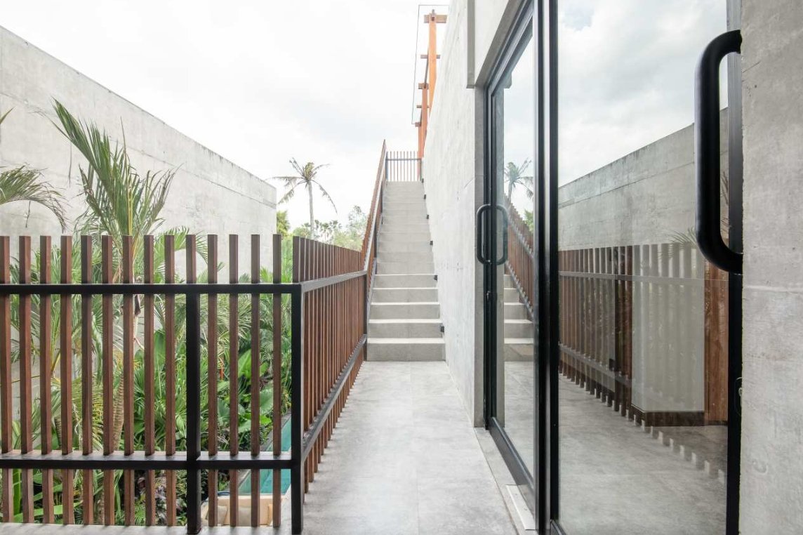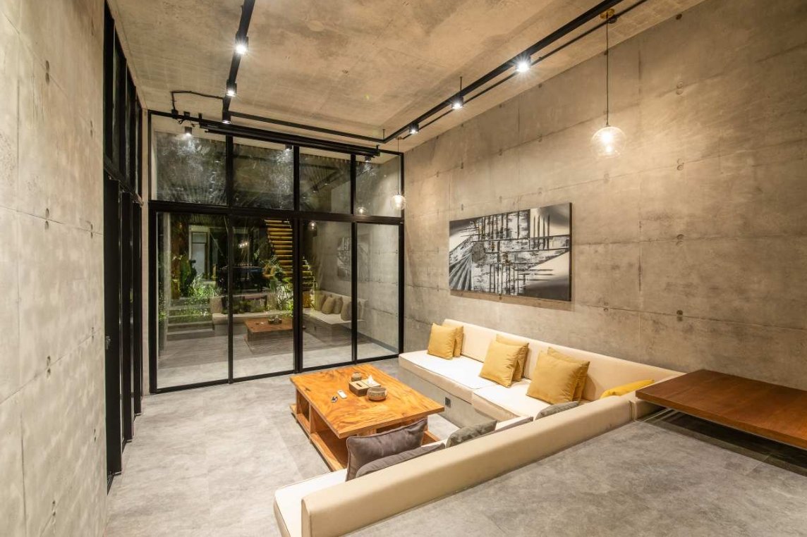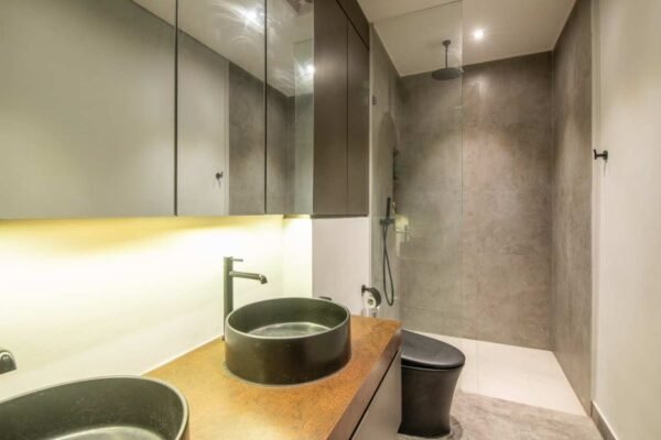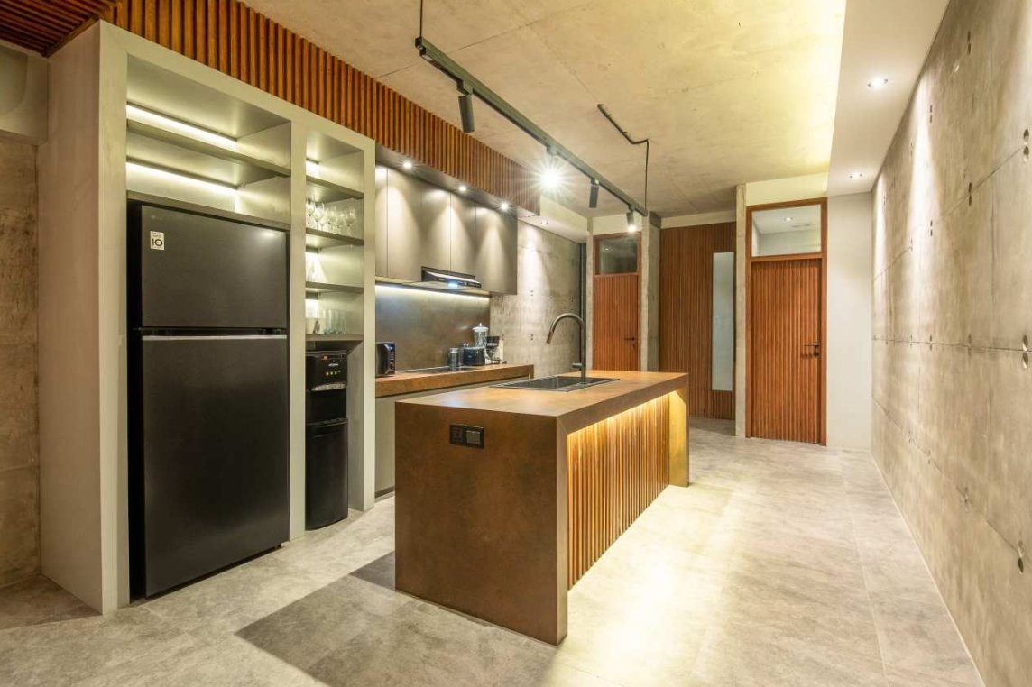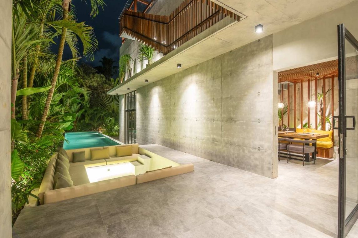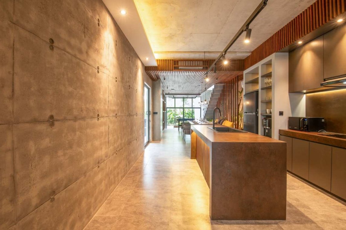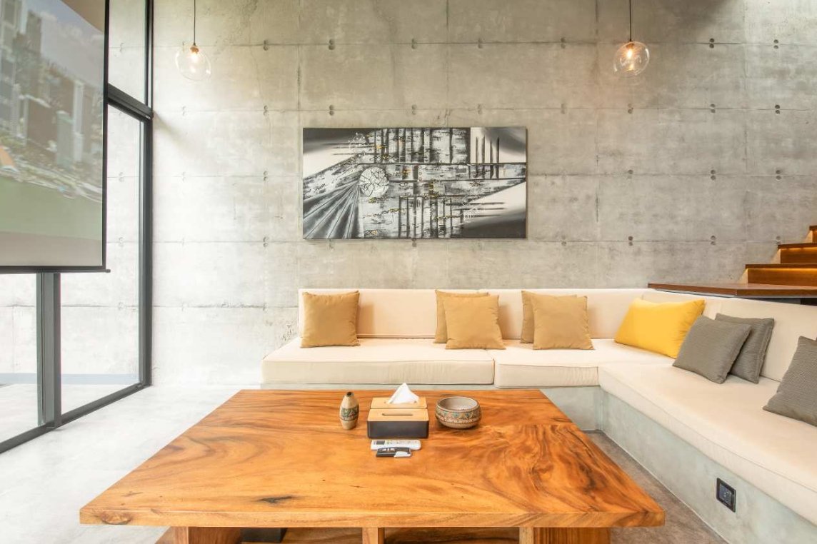 Villa Robyn’s features four spacious bedrooms, each equipped with a king-size bed and a private ensuite bathroom. With 4.5 bathrooms in total, privacy is guaranteed—even for large groups. The interiors blend raw concrete walls with warm wood accents, creating a modern yet inviting atmosphere that feels both chic and relaxed.