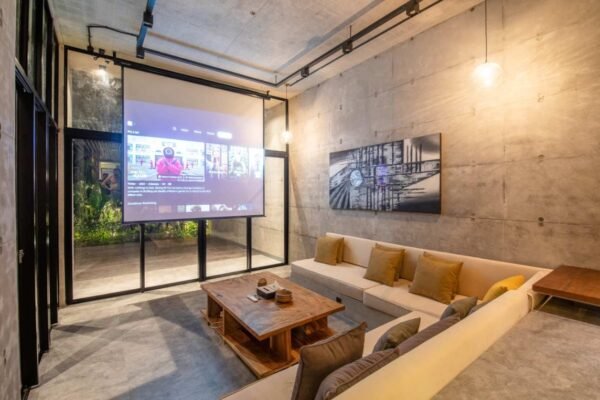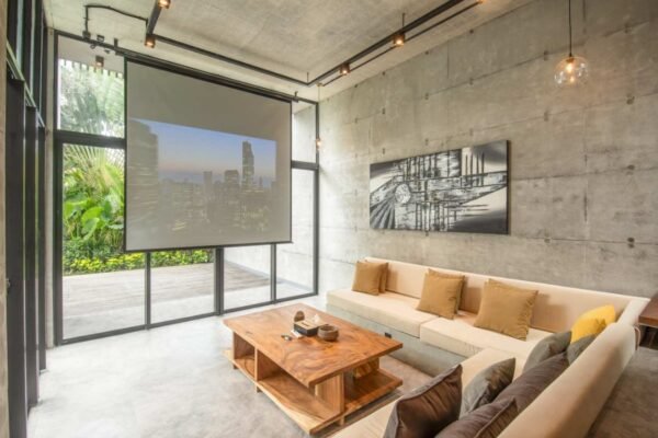 • A cozy home cinema corner with projector for movie nights