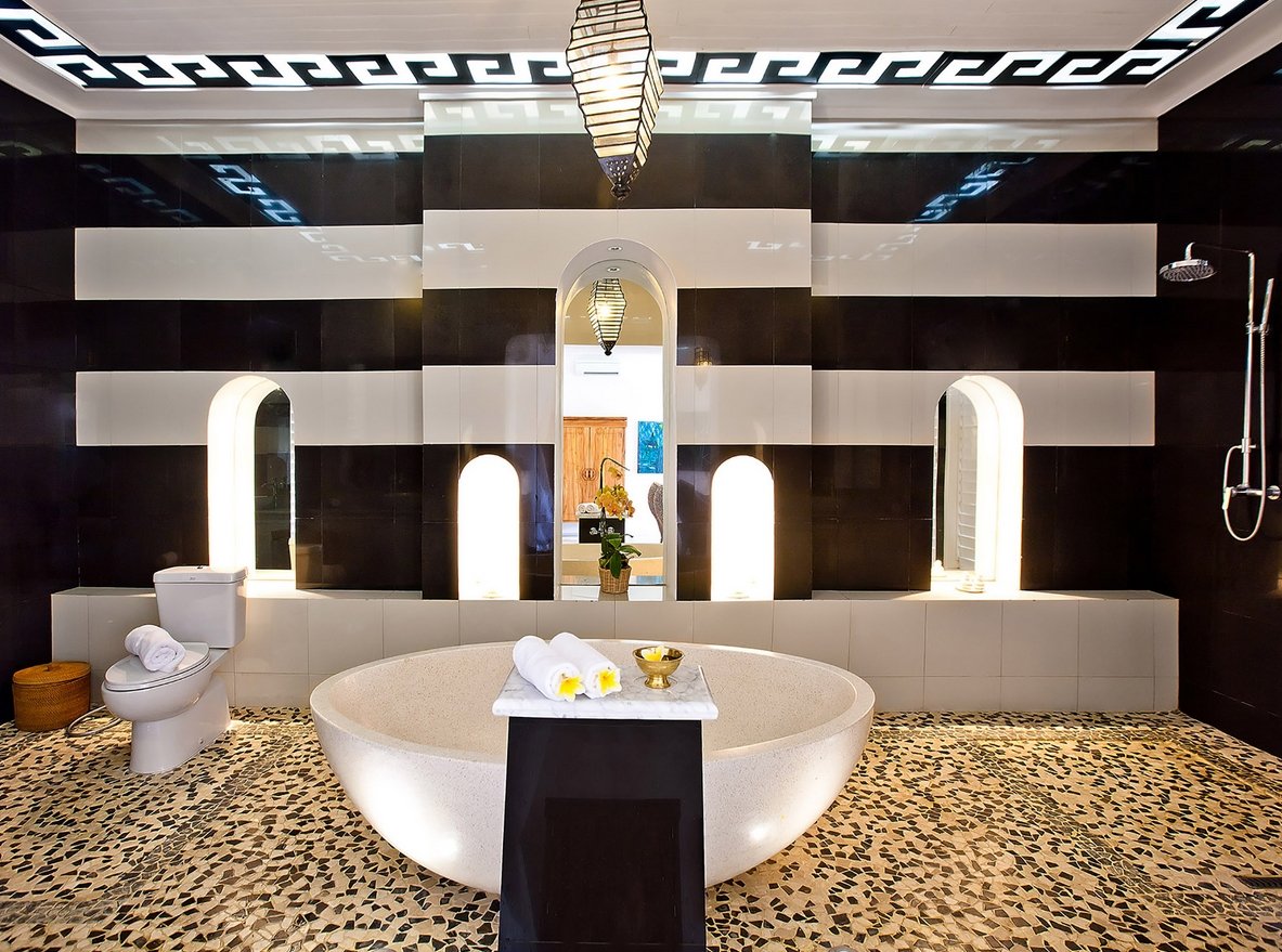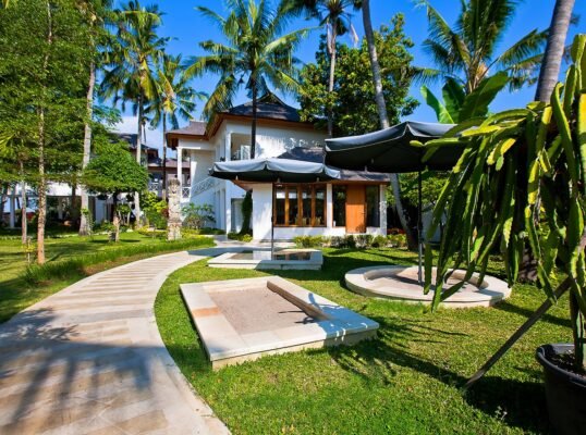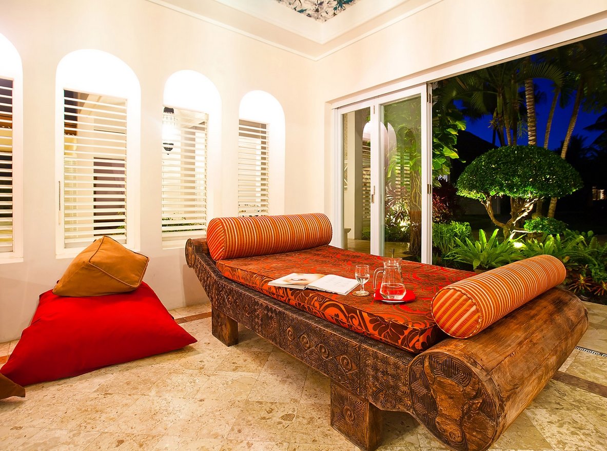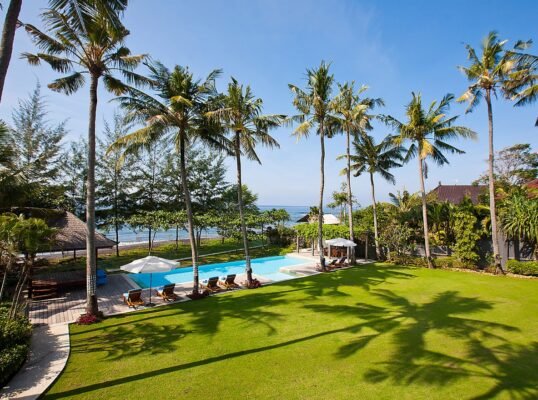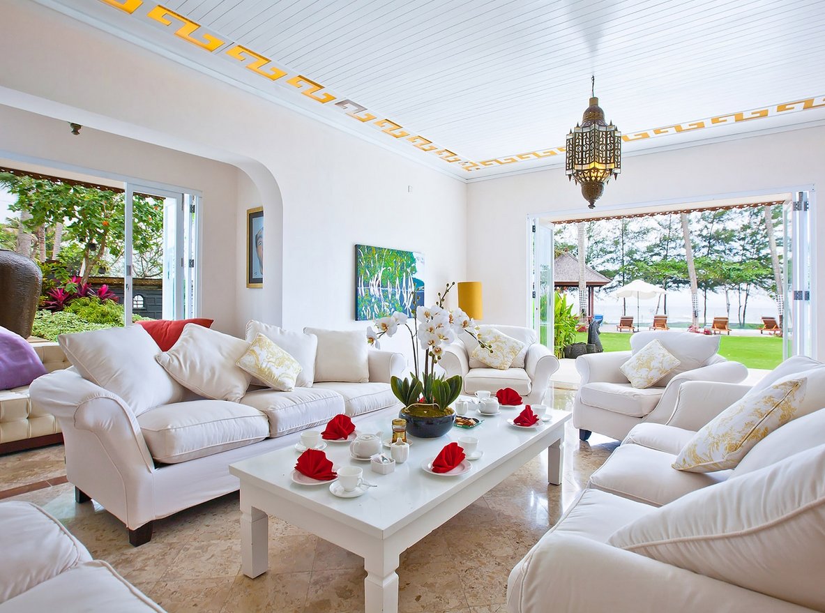 The six bedroom villa is set in beautifully landscaped gardens and enjoys an absolute location beachfront on the dramatic black sand surf beach. This six-bedroom contemporary-meets-colonial-style villa sits on a wild stretch of black-sand beach between the resort towns of Sanur and Candidasa on Bali’s south-eastern coast.