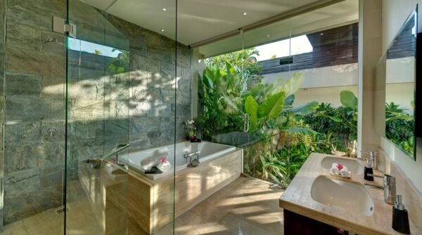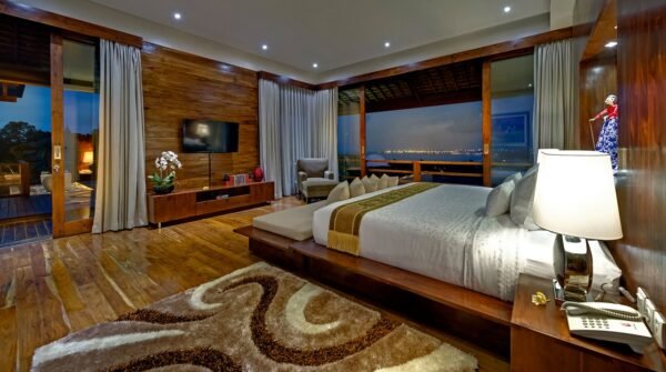 Perched high above Jimbaran Bay, this architect-designed villa blends traditional Balinese elegance with sleek modern design. Floor-to-ceiling glass panels invite sunlight and panoramic ocean views, while polished wood floors, serene water features, and an 18-meter infinity pool add a sense of indulgent calm.