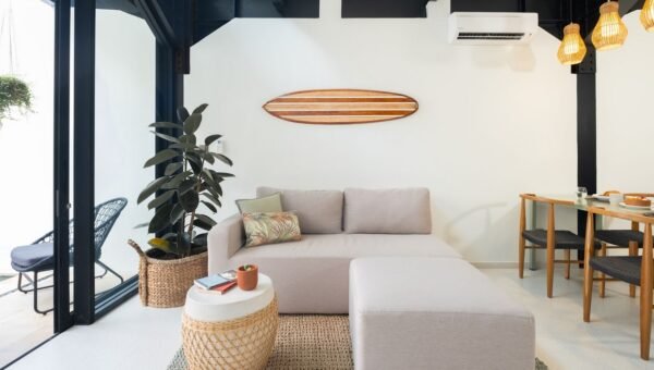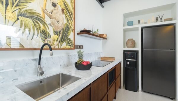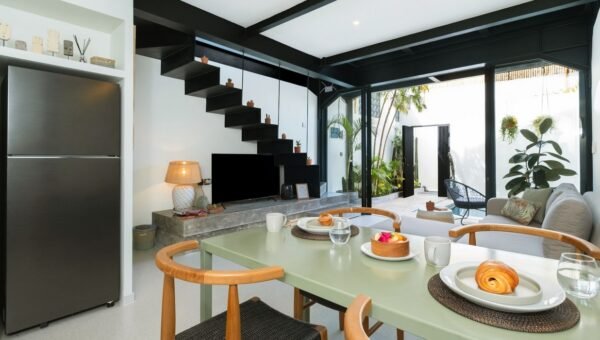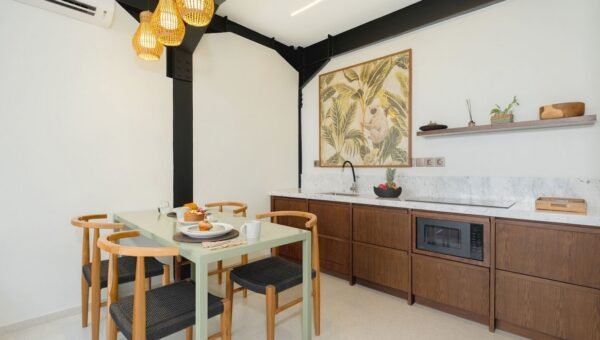 Inside, the villa blends style and comfort with tasteful décor, high ceilings, and inviting seating. A compact but fully equipped kitchen and adjacent dining nook make meal prep simple and enjoyable. The open, airy layout ensures a relaxed, homey feel.