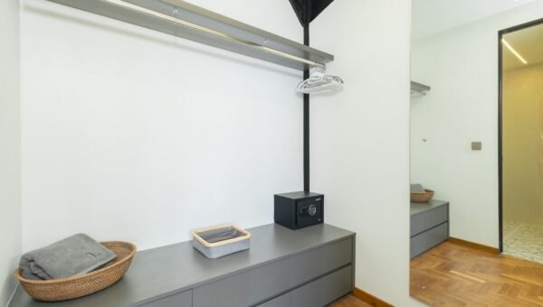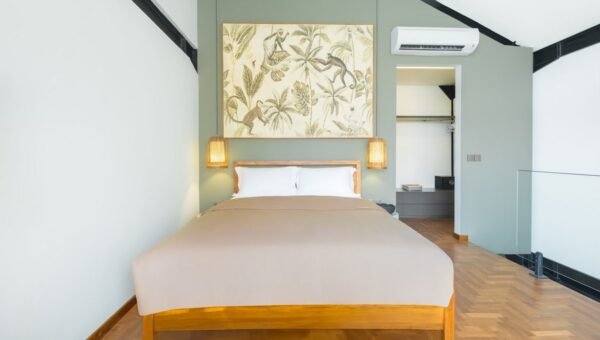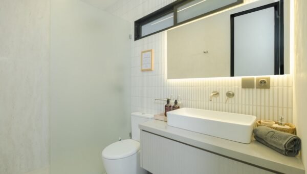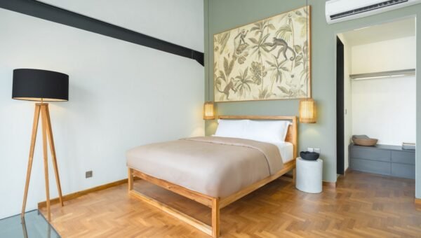 The cozy bedroom is thoughtfully designed for comfort and relaxation. Featuring plush linens, air conditioning, and an ensuite bathroom with a modern rain shower, it creates a spa-like atmosphere. Ample storage and modern amenities make it a perfect space to unwind after a day exploring Bingin.