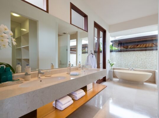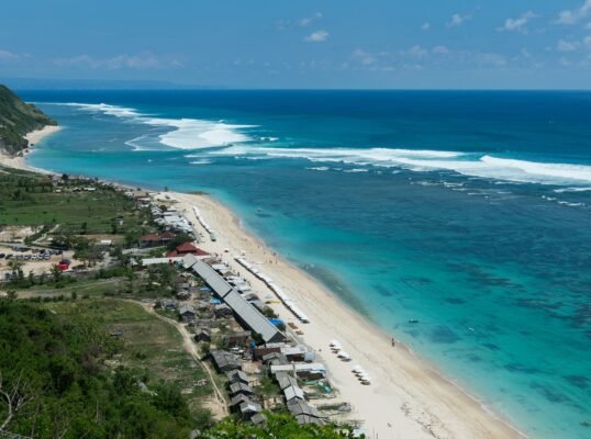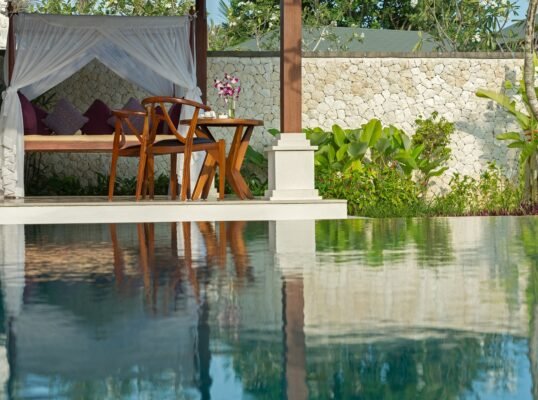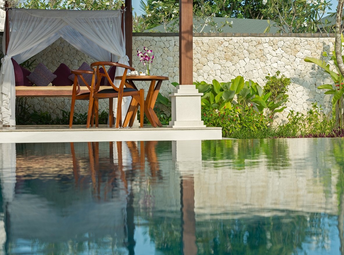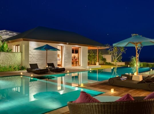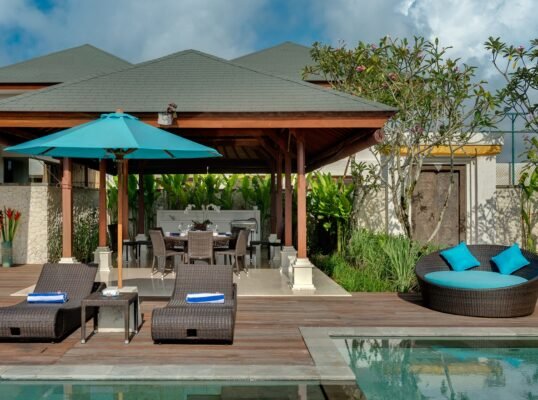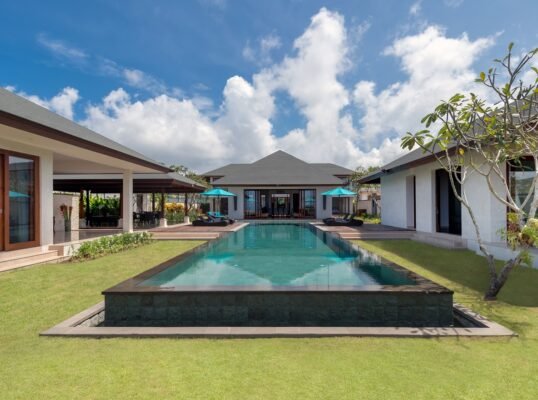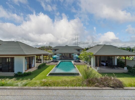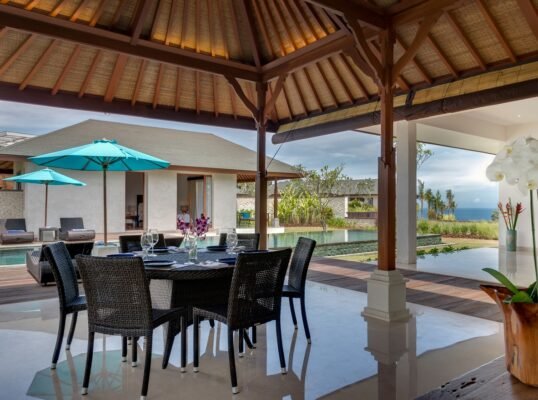 The villa is set high above the ocean on Bali’s scenic Bukit Peninsula, making a superb wedding and event venue. Six-bedroomed Villa, one of four luxury rental properties on the estate, offers a 16-metre pool, a centrally situated, family-friendly living pavilion and a large poolside barbecue balé, set amidst pretty ponds and tropical gardens with ocean views.