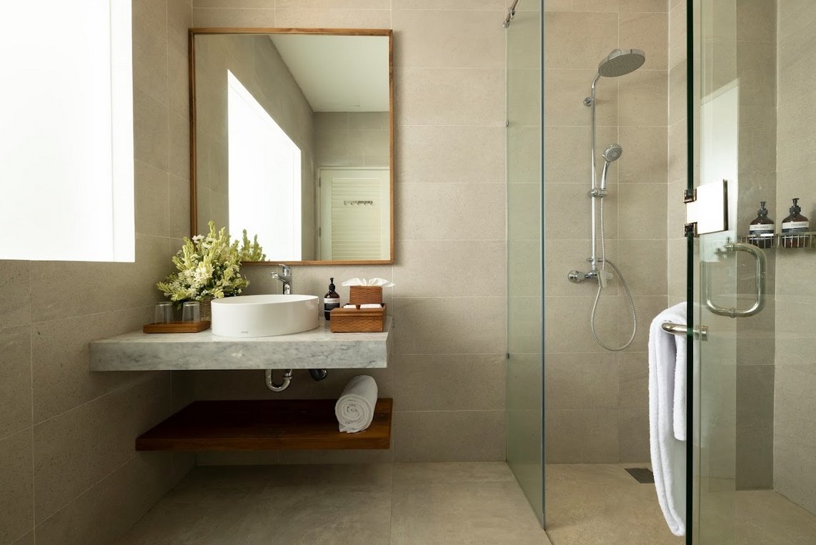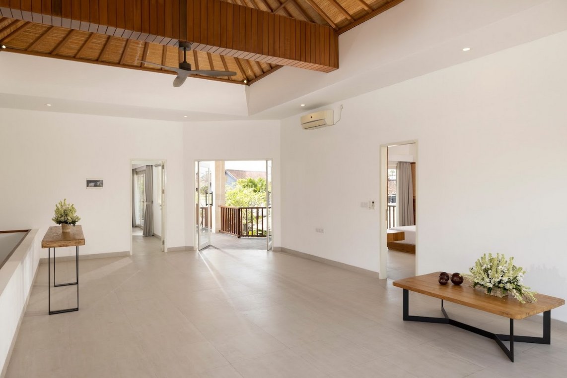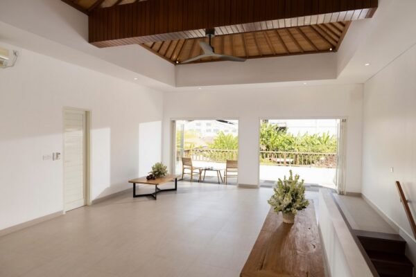 The villa’s open-plan living and dining area blends contemporary elegance with warm, natural finishes. High ceilings and bright accents create an airy, welcoming atmosphere.