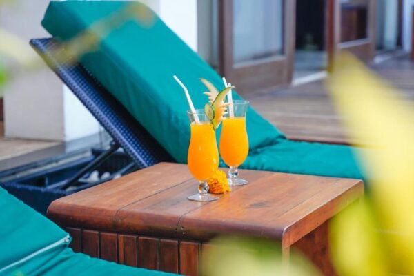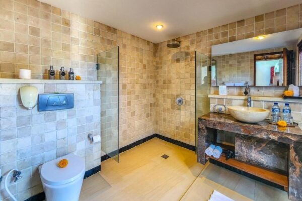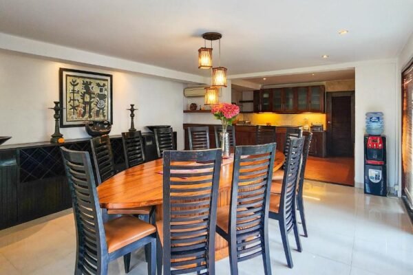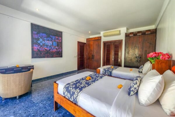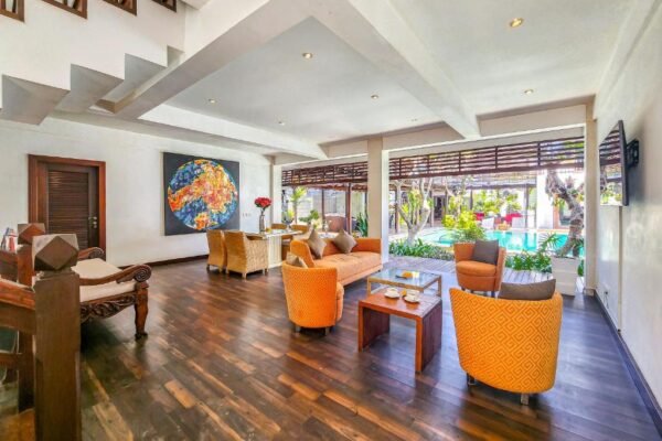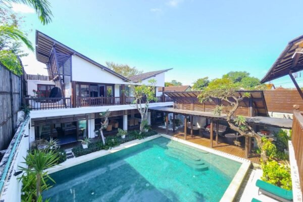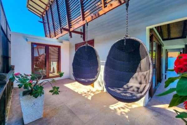This expansive 800 m² villa offers six fully air-conditioned bedrooms, including four double and two twin rooms — each thoughtfully styled with Balinese accents and private balconies with hammocks for ultimate relaxation.