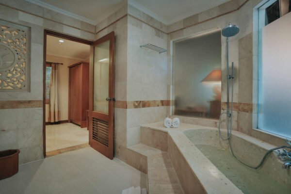 The villa’s oversized spa bathroom, with a bathtub and rain shower, feels like your own private wellness retreat. Elegant interiors with Balinese accents — from handwoven bamboo to carved wood details — elevate the experience, blending island tradition with modern-day luxury.