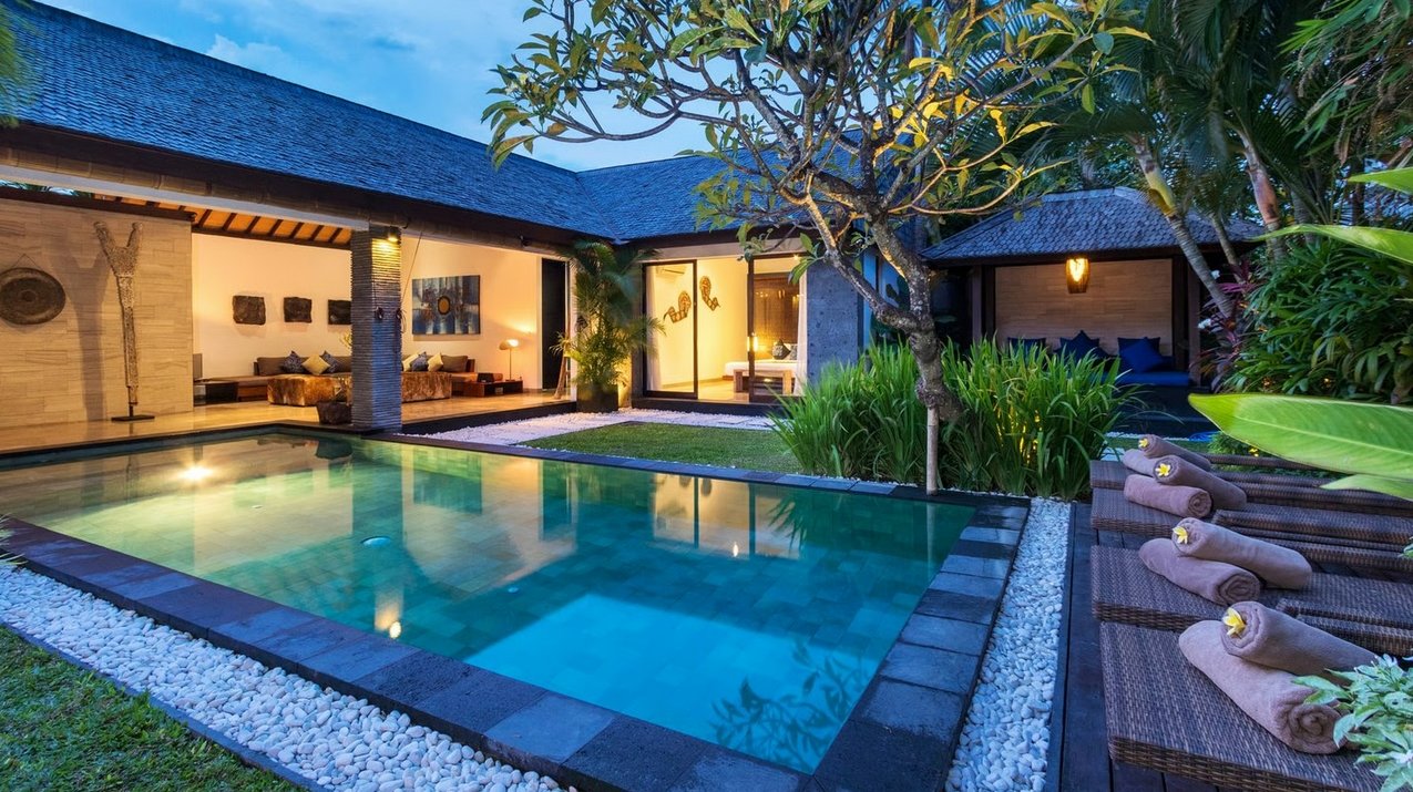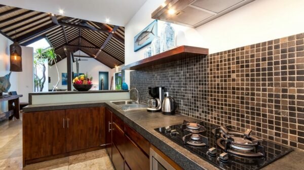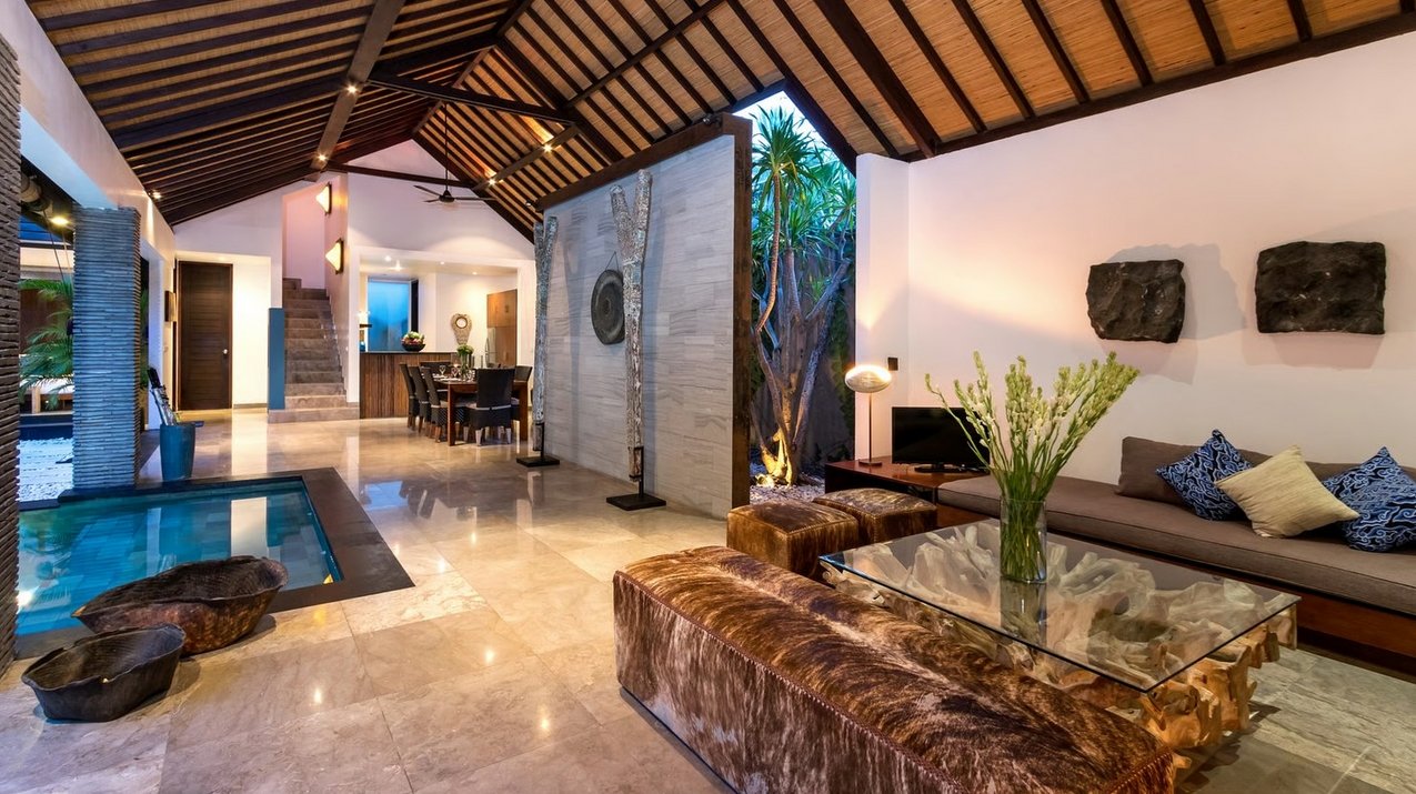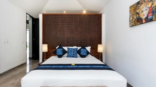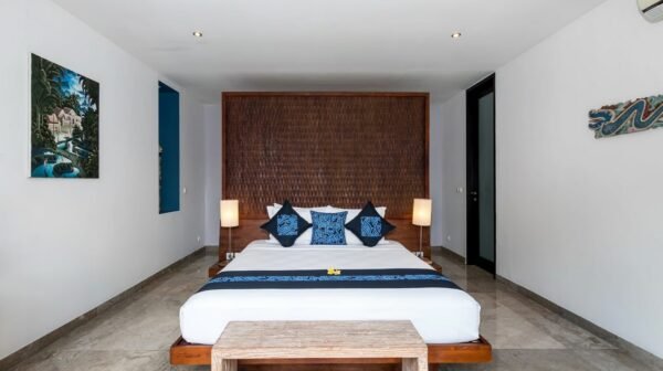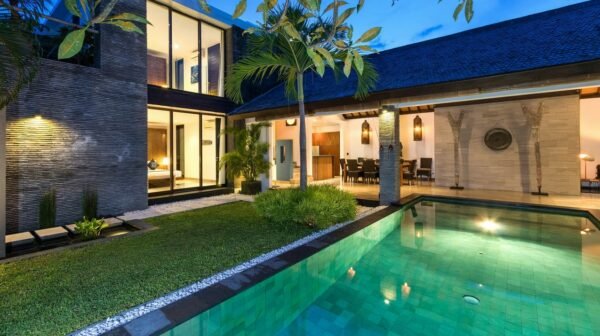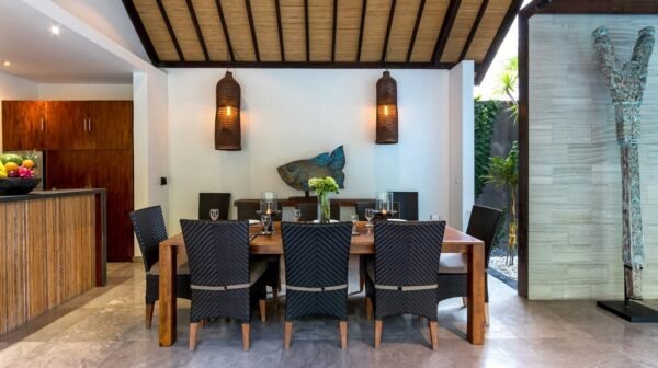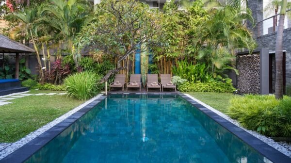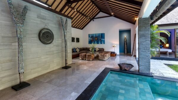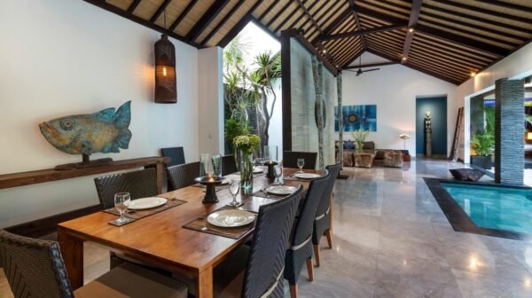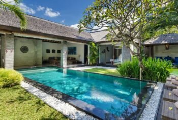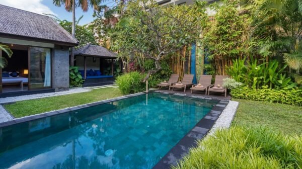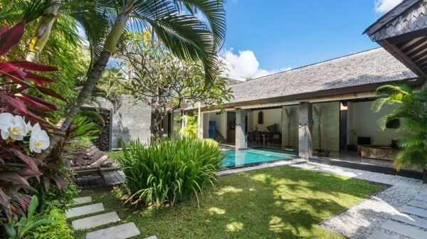 Tucked in the heart of trendy Petitenget – Seminyak, this elegant 4-bedroom villa blends traditional Balinese architecture with open-plan living and cool tropical design. The villa is part of an exclusive villa estate, designed in a linear “long house” layout, and surrounded by lush gardens, a stunning 9-meter pool, and a peaceful ambiance just minutes from the beach, cafes, and beach clubs.
