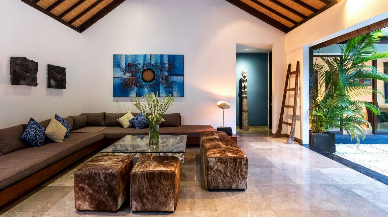 - Stylish lounge with L-shaped sofa, ottoman, and curated blue-themed artwork