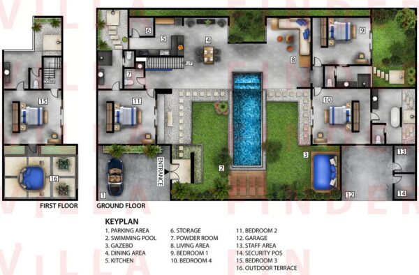- 3 rooms downstairs (2 with pool access, 1 with private garden)