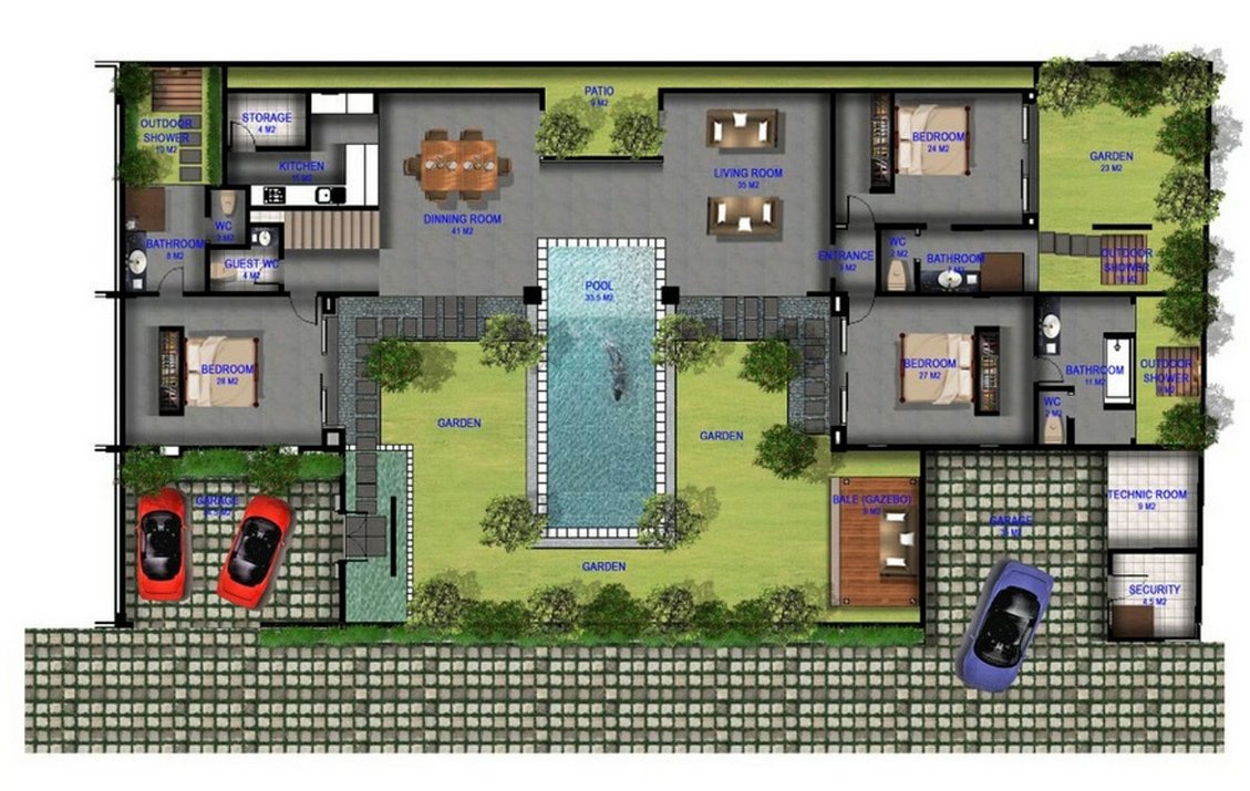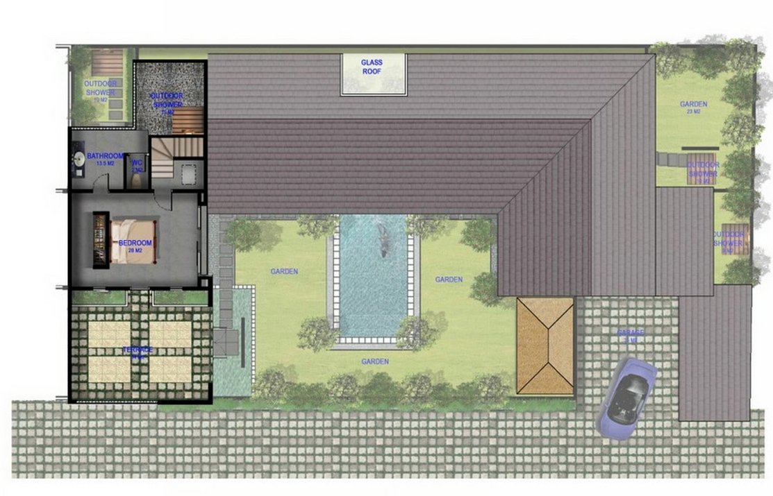 - Ensuite bathrooms with indoor area + outdoor tropical rain showers