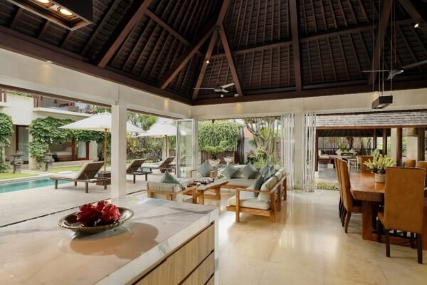 The expansive 10m x 10m open-plan living pavilion showcases traditional Balinese design, with a soaring raked timber ceiling. Modern bi-fold doors allow for a fully air-conditioned space when needed. The informal lounge area offers pool views and a cozy spot for reading or socializing.
