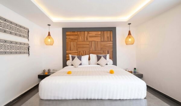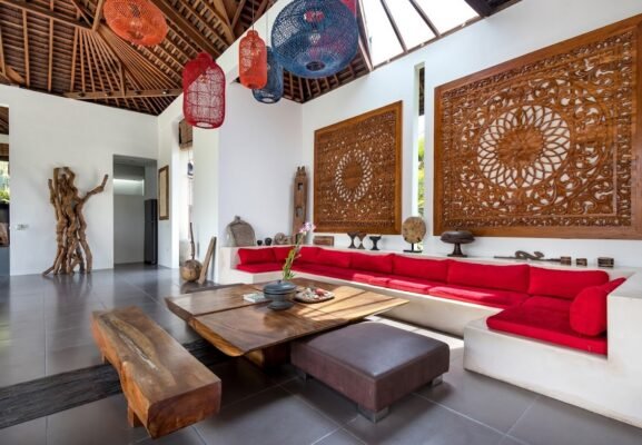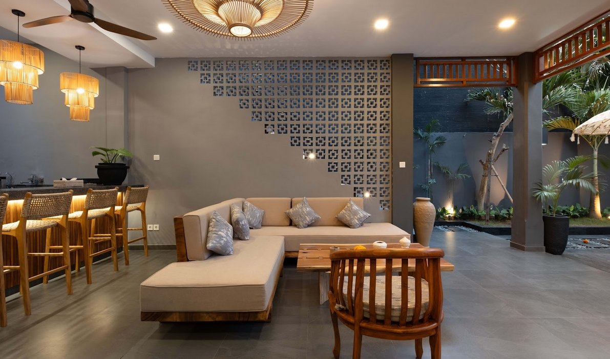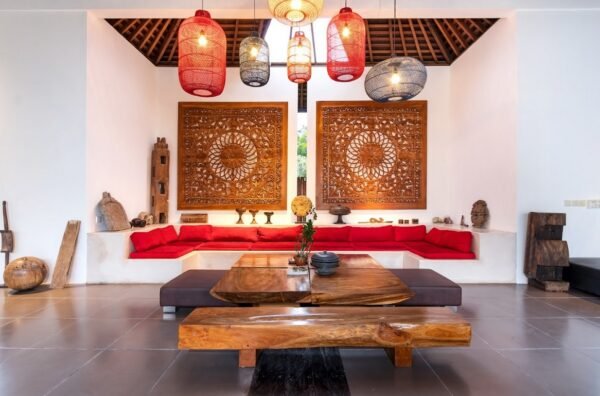 The open-plan living areas blend modern minimalist design with ethnic accents. Features include: