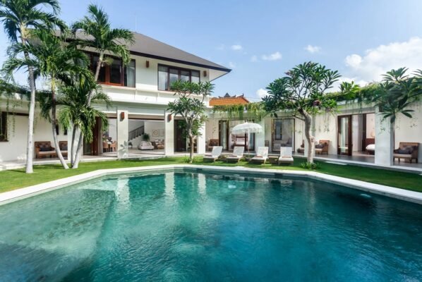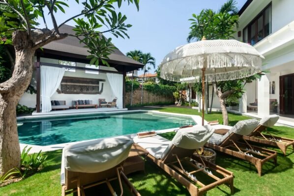 The villa’s layout gracefully curves around a manicured lawn and a striking private pool, creating a tranquil courtyard atmosphere. The photogenic swimming pool, finished with turquoise tiles inspired by gemstone facets, is the centerpiece of the outdoor area. A row of comfortable daybeds and a sheltered seating area provide the perfect spots to unwind after a refreshing swim or enjoy relaxed afternoons under the Bali sun.