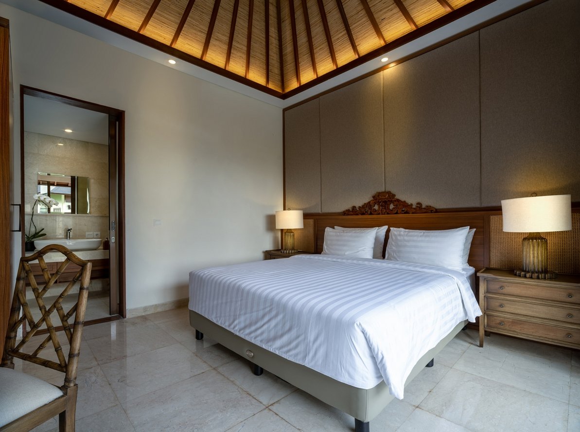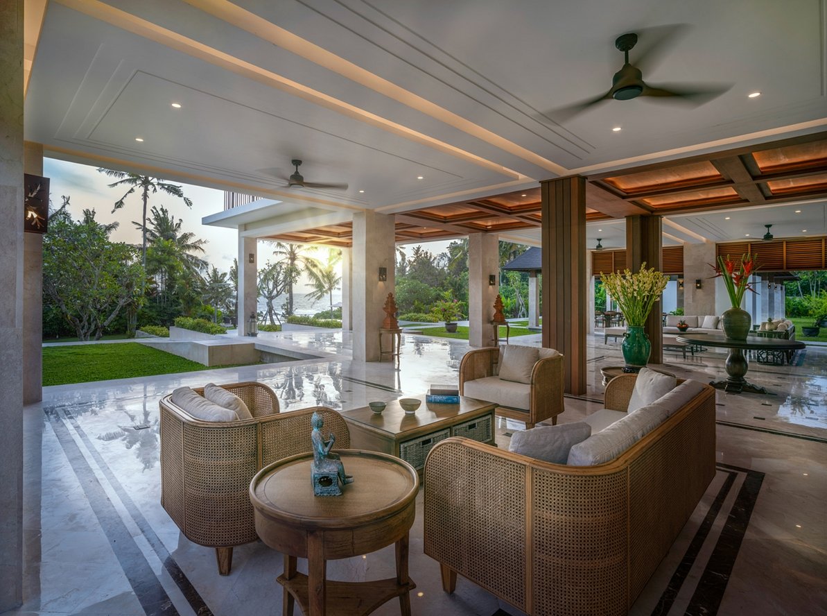 Each of the 9 bedrooms sits within its own private pavilion, ensuring peace and privacy. With sliding glass doors, daybeds, and terraces overlooking the gardens or ocean, the rooms are designed for both comfort and elegance. En-suite bathrooms feature rain showers, twin basins, and statement bathtubs for a spa-like experience.