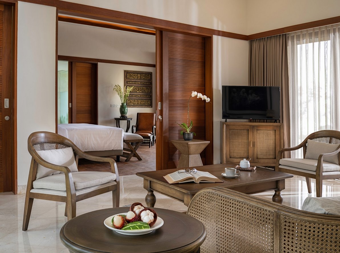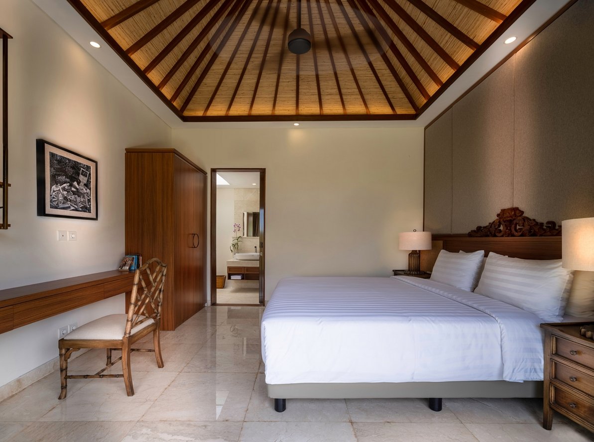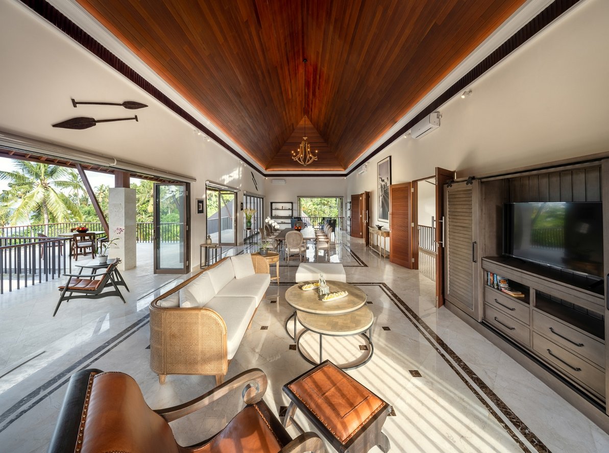 The open-sided living pavilion, decorated with tribal art and antiques, is the heart of the villa. Gather with friends and family on rattan sofas, enjoy meals at the long dining table, or sip wine as the sun sets over the horizon. A traditional lumbung (rice barn) adds a charming cultural touch, doubling as a playhouse or private retreat.