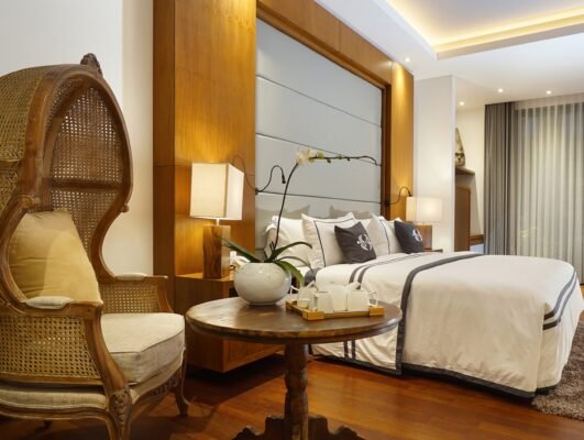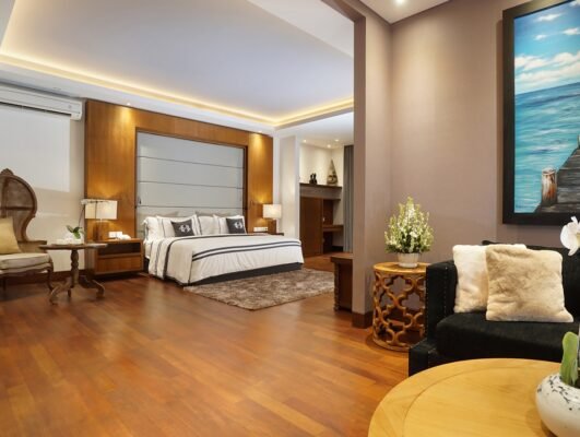 Four Deluxe Suites: Ground-floor king-size bedrooms with private lounges, indoor/outdoor marble-tiled bathrooms, and pool views. Each suite has a veranda with teak daybeds and dining tables.