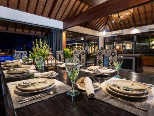Accommodates 10 adults with two extra rollaway beds available. High chair, baby cot, and children’s cutlery provided. Ideal for weddings or events: up to 50 guests in a single villa or 150 across two villas.