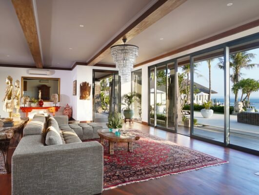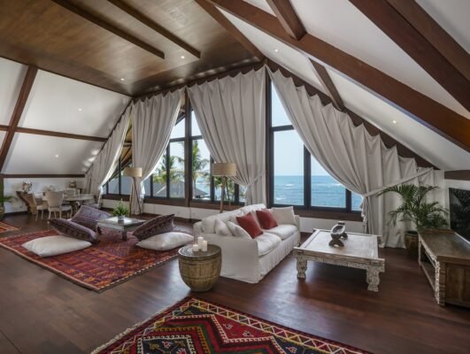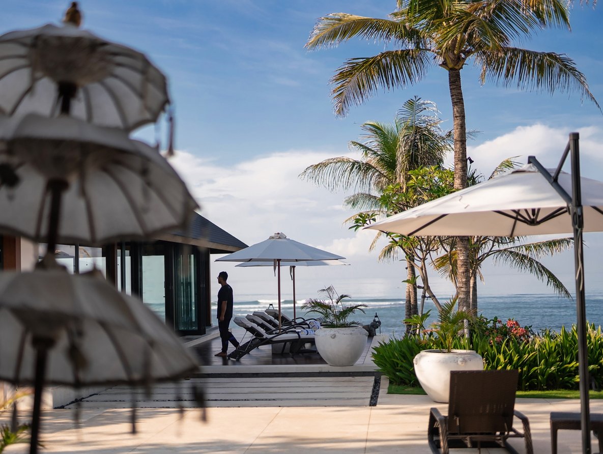 Step into the air-conditioned lounge, where shades of blue reflect the infinity pool and ocean beyond. Relax on an extra-long sofa surrounded by antique Torajan carvings and masks. The kitchen, dining, and lounge pavilion features glass bi-fold doors for seamless indoor-outdoor living, a fully equipped kitchen with marble counters, a wine fridge, and a dining table for ten. Sofa and beanbag seating offer the perfect vantage for ocean views.
