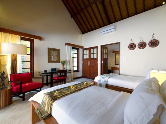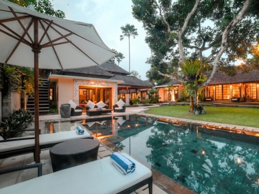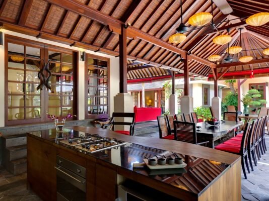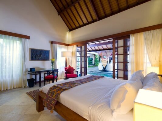 The villa comprises six spacious bedrooms: three king-bedded and three twin-bedded. French doors in each bedroom open to peaceful gardens, just steps from the pool and lawn. All suites include walk-in wardrobes and luxurious bathrooms, arranged in an L-shape for privacy.