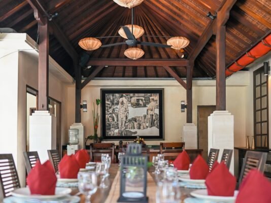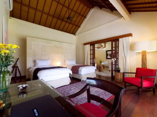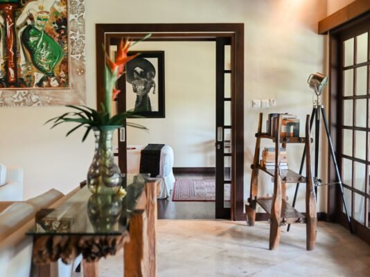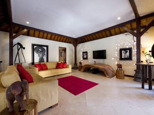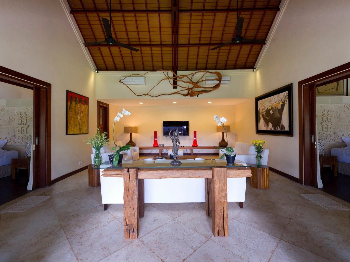 The villa’s heart is the modern two-storey living pavilion with a curated collection of wooden art pieces and open-sided living areas. The six-bedroom suites are positioned discreetly around this central pavilion, offering both privacy and easy access to communal spaces.