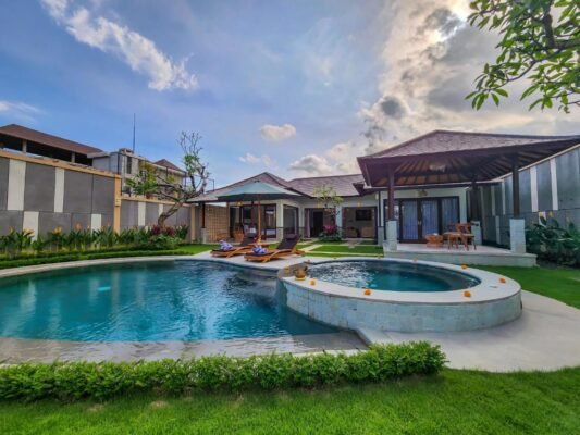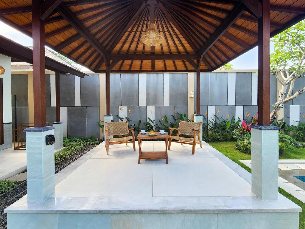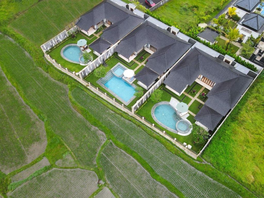 Step inside to a sunlit open-plan living space with views of the pool and tropical gardens. Each bedroom has its own ensuite bathroom, ensuring comfort and privacy. Built on 500 sqm of land, the villa feels like your own private resort — a place to truly unwind. Imagine soaking in the jacuzzi at golden hour or enjoying a floating breakfast as the sun rises over the rice fields.